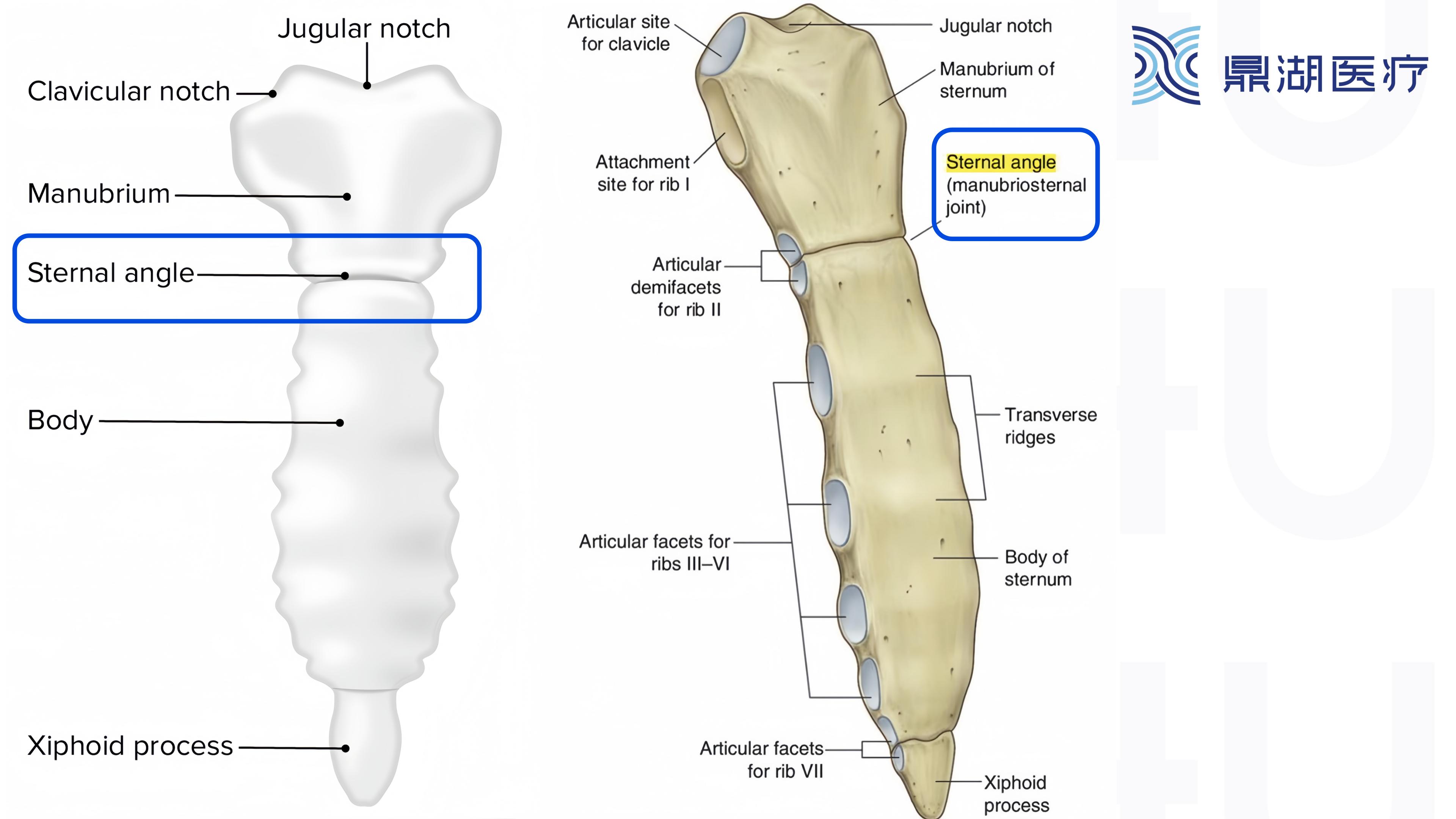 2.心脏病学中最重要的骨骼标志之一。在心电图操作中,可根据胸骨角找到右侧第四肋间隙,从而准确地找出放置V1导联电极的位置;