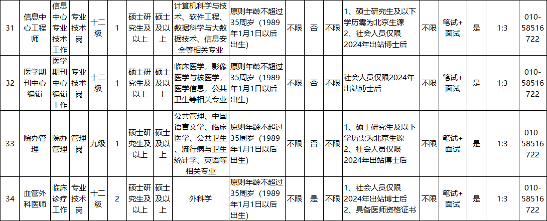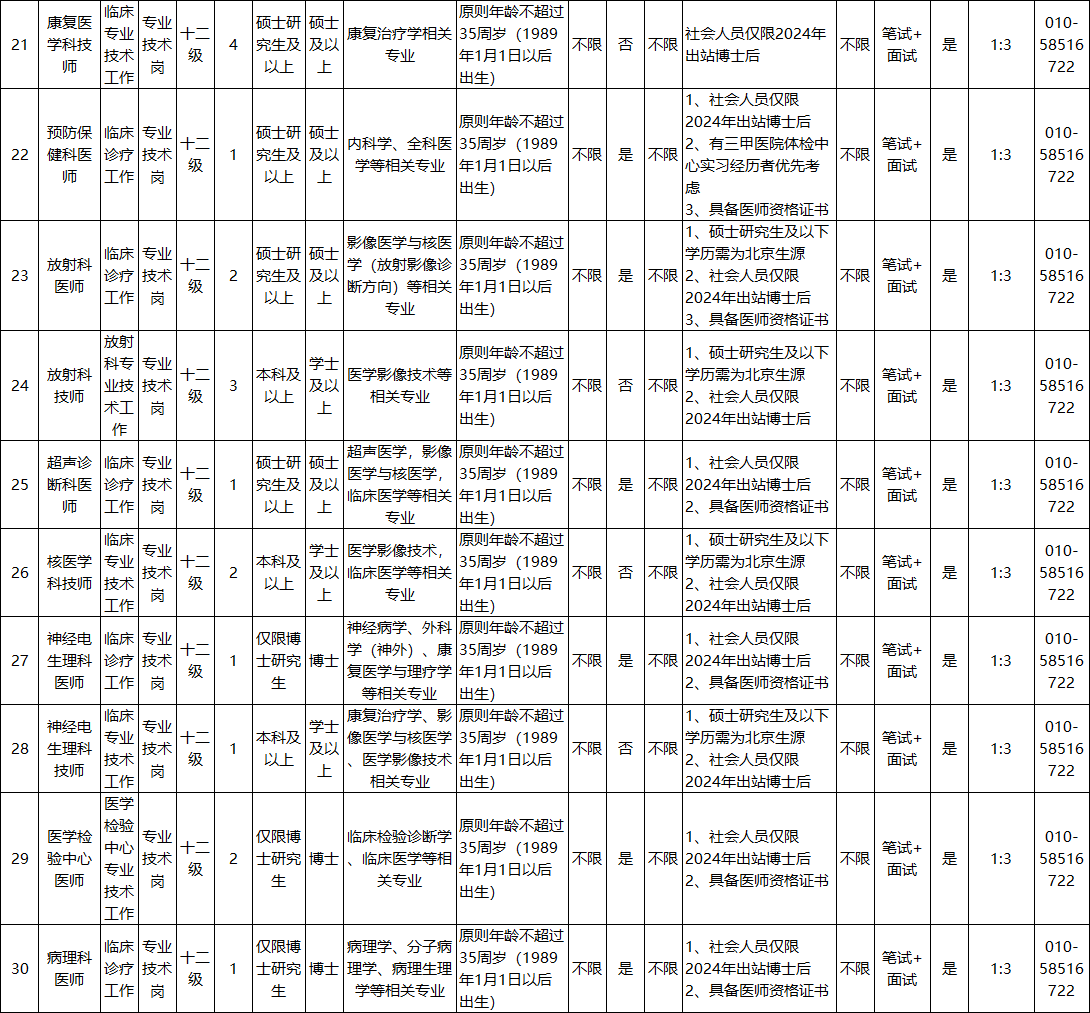 根据《关于印发<北京市事业单位公开招聘工作人员实施办法>的通知》(京人社专技发〔2010〕102号)、《关于进一步规范事业单位公开招聘有关问题的通知》(京人社专技发〔2012〕247号)、《北京市引进毕业生管理办法》(京人社毕发〔2021〕22号)等文件精神,结合医院工作,现将公开招聘事宜公告如下:
