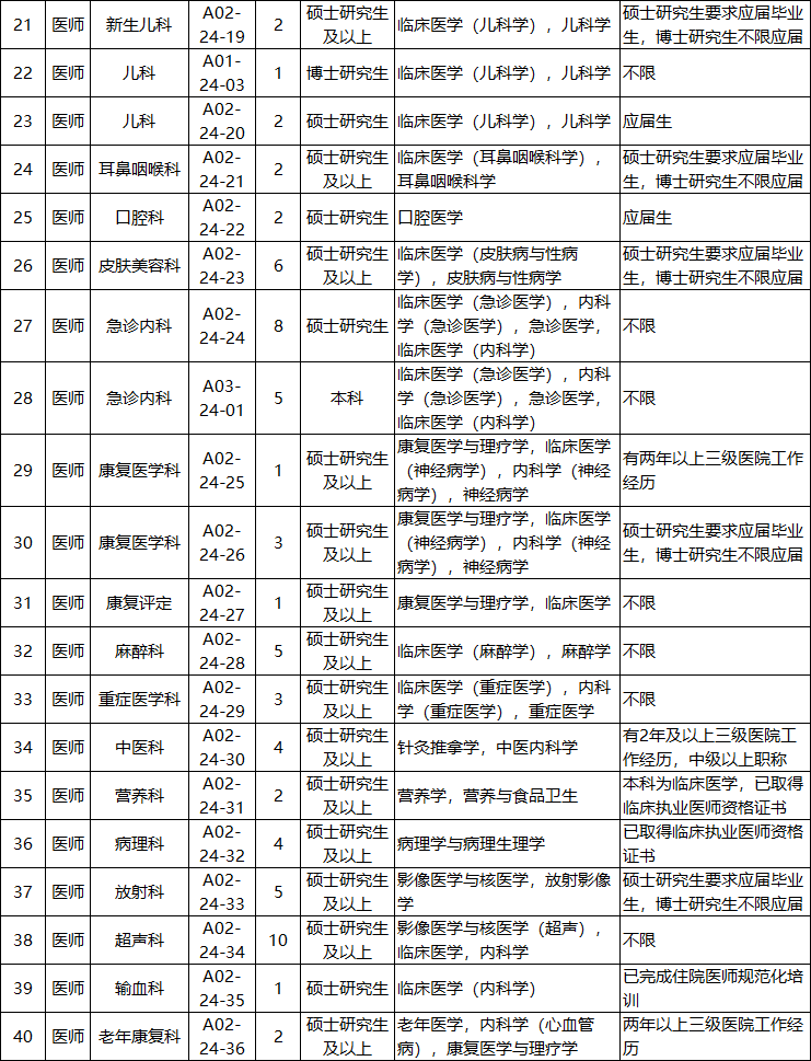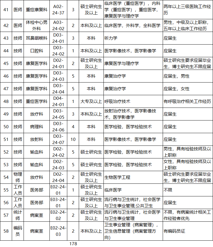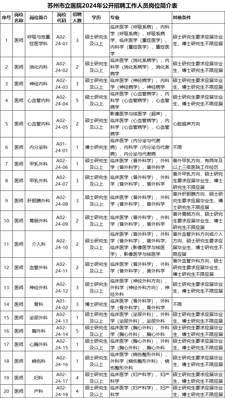 本次招聘需求为55个岗位,共178人。具体岗位名称、招聘人数及各个招聘岗位的条件详见附件:《苏州市立医院2024年公开招聘工作人员岗位简介表》。