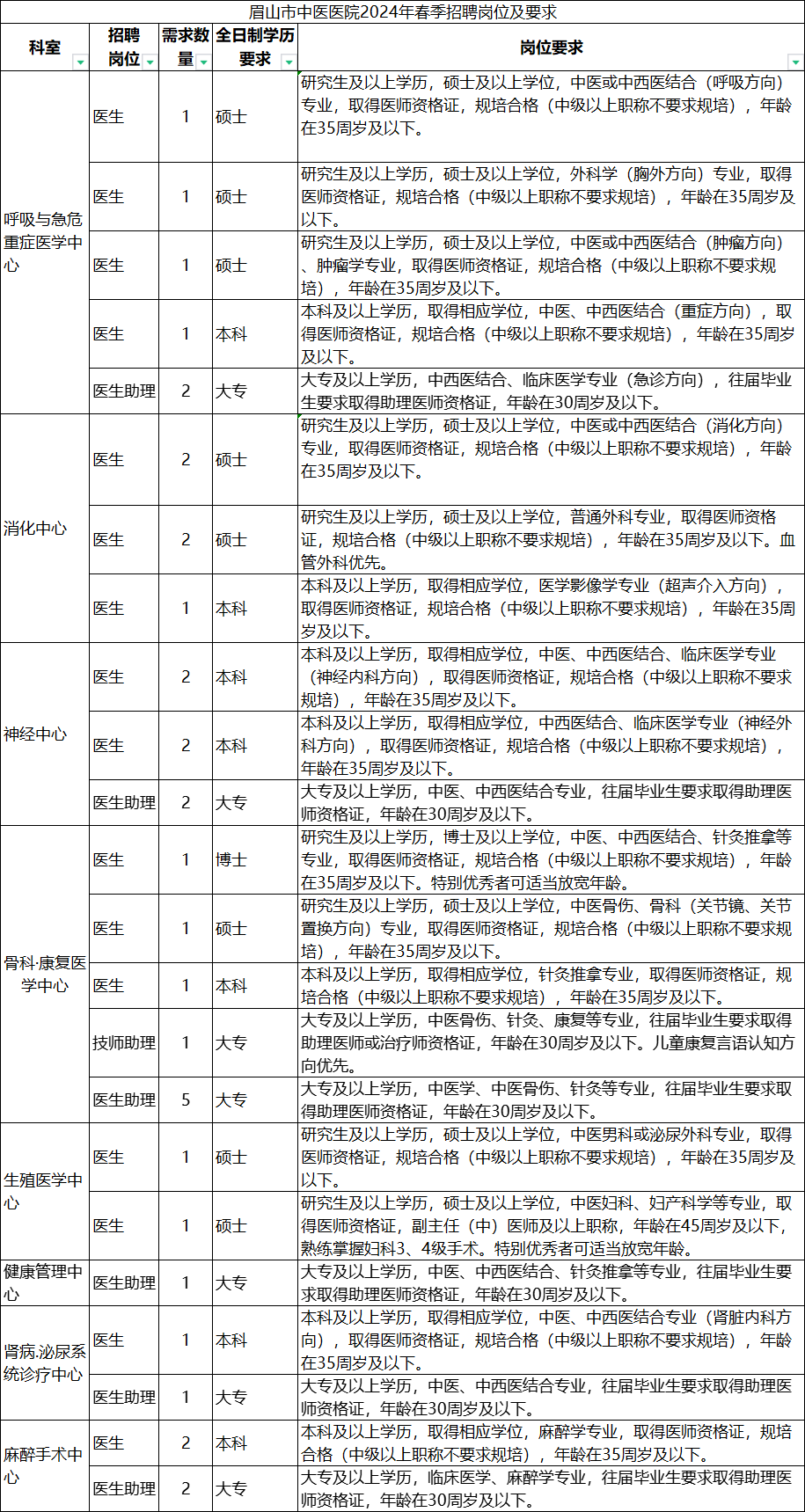 根据工作需要,眉山市中医医院面向社会公开招聘各类人才。现就有关事项公告如下: