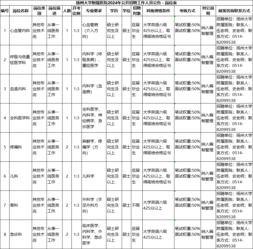 扬州大学附属医院人力资源处负责回答此次招聘政策咨询。