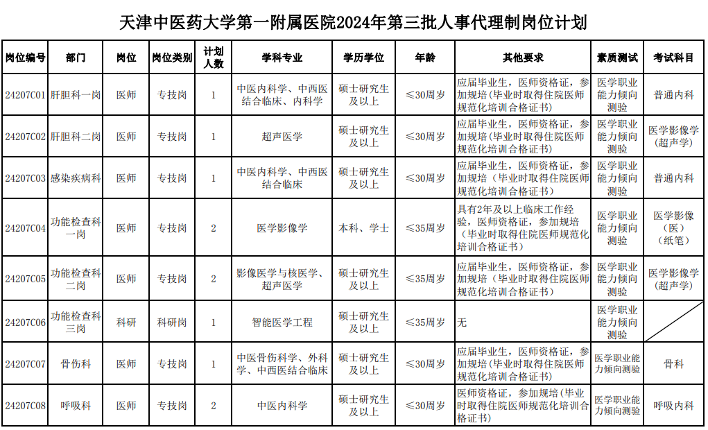 具体招聘岗位见《天津中医药大学第一附属医院2024年第三批人事代理制人员招聘岗位计划》。