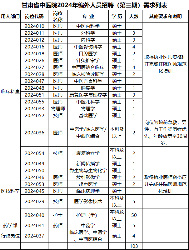 6.具备岗位要求的其他条件(见附件1:甘肃省中医院2024年编外人员招聘(第三期)需求列表(1)》,以下简称“需求列表”)。