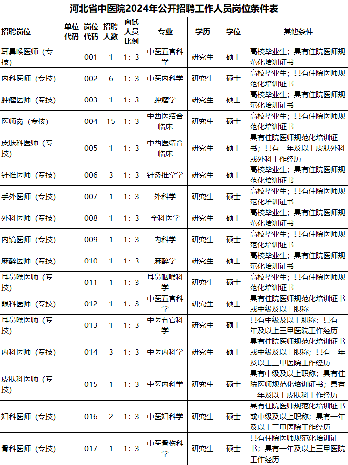 河北省中医院拟公开招聘工作人员145名。具体招聘人数和岗位条件详见《河北省中医院2024年公开招聘工作人员岗位条件表》(附件1),其中专业参考教育部《授予博士、硕士学位和培养研究生的学科、专业目录》、《普通高等学校本科专业目录》、《普通高等学校高职高专专业参考目录(试行)》等设置。