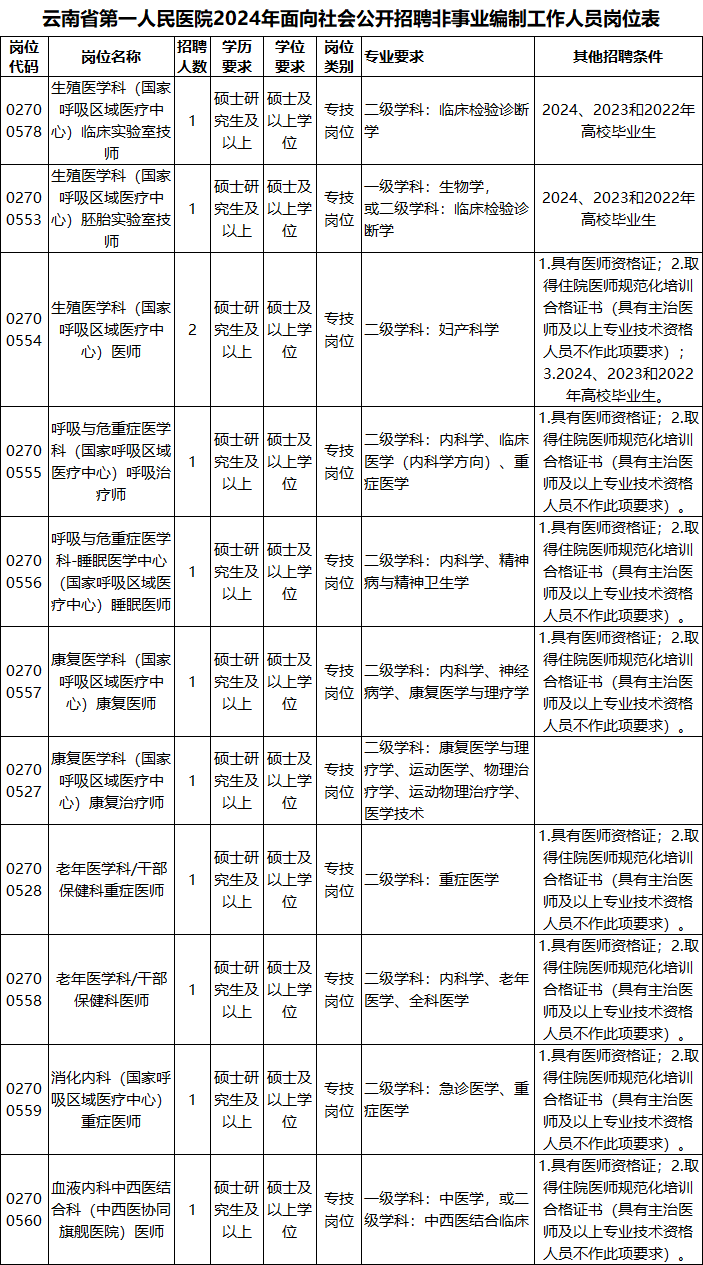 本次招聘岗位及人数详见《云南省第一人民医院2024年面向社会公开招聘非事业编制工作人员岗位表》(附件1);可通过云南省第一人民医院官网(www.ypfph.com)“人才招聘”栏目查询或云南省卫生健康人才网(https://www.ynwsjkrc.cn/)“人才服务-招聘公告”栏目查询。