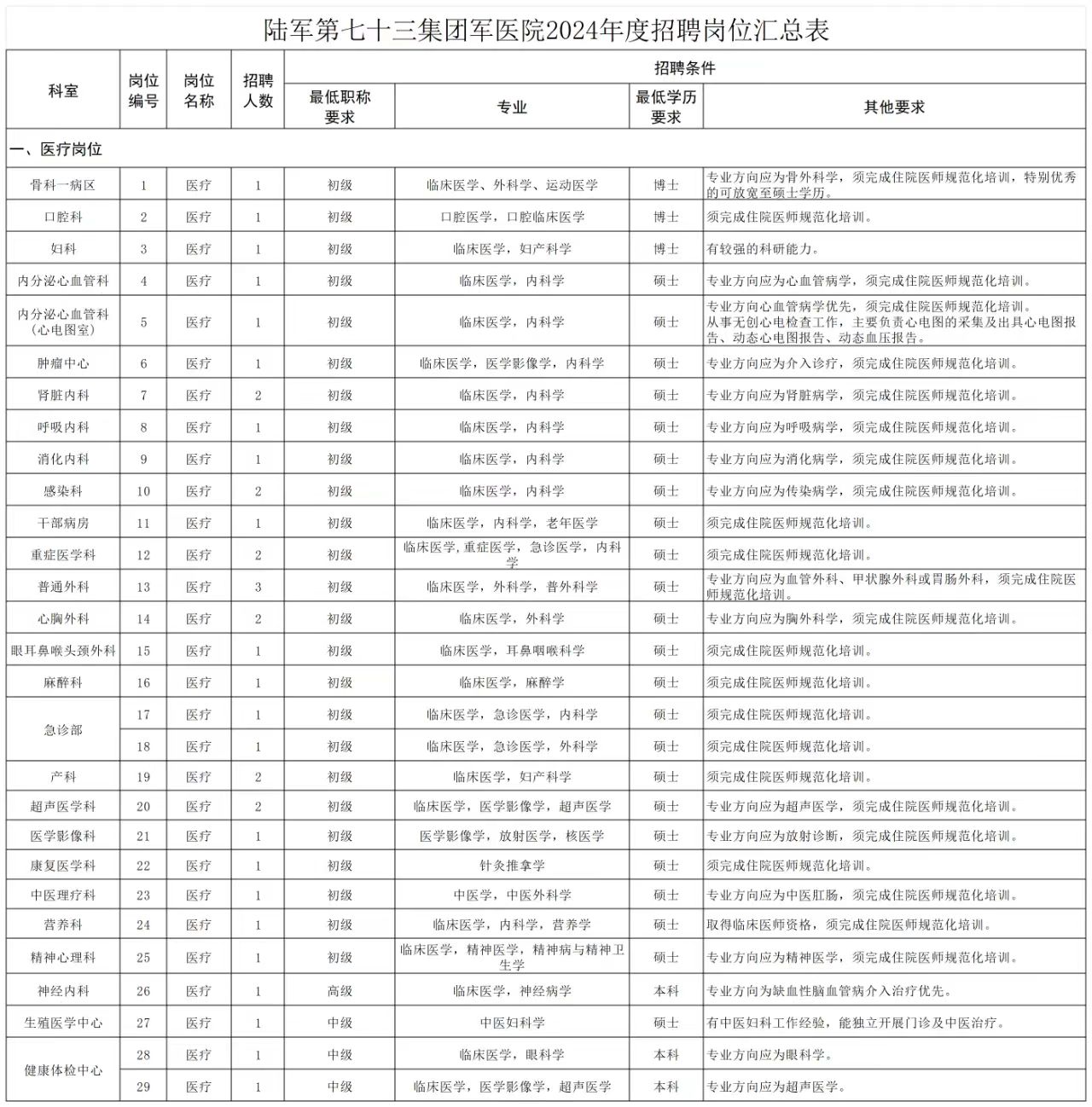 具体招聘岗位和条件见《陆军第七十三集团军医院2024年度招聘岗位汇总表》。