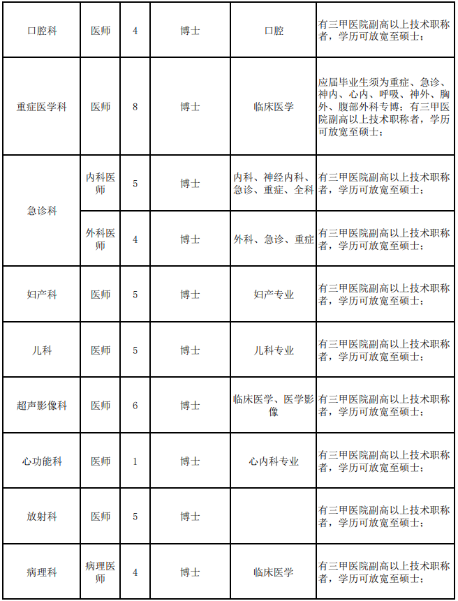 (一)医师岗位。职数76人,要求:博士学历(应往届均可)、或硕士学历(具有三甲医院卫生系列高级技术职称)。招聘计划、要求详见下方附件一。