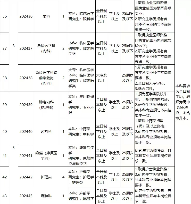 本次招聘设43个岗位(A类岗位采用直接面试的方式,不设置开考比例。B类岗位采用笔试+面试的方式),具体岗位详见附件《明光市人民医院2024年公开招聘工作人员岗位计划表》(以下简称《岗位计划表》)。