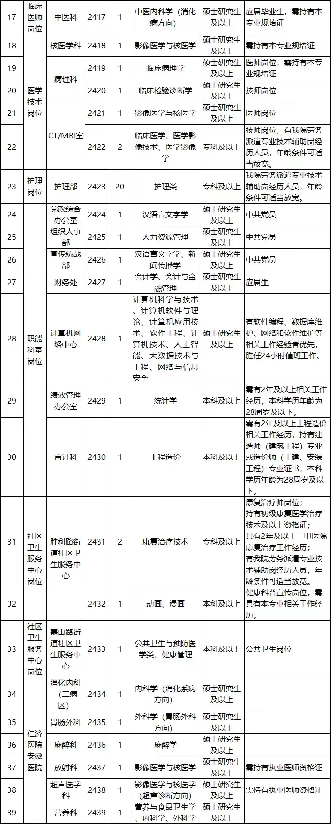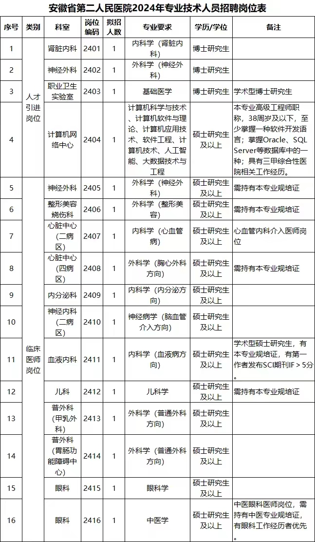 一、招聘岗位及人数:见附件《安徽省第二人民医院2024年专业技术人员招聘岗位表》(以下简称“岗位表”)。