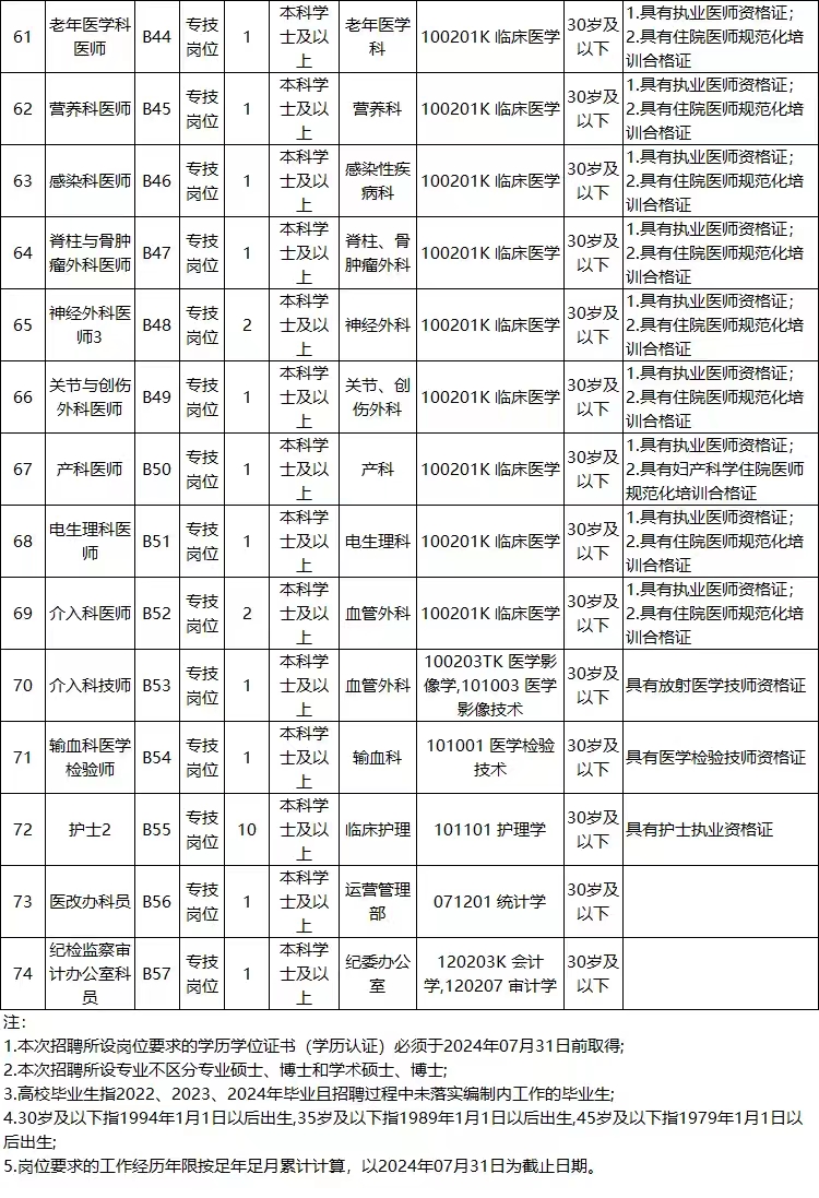 (6)应聘医师、护士岗位的,须提供与招聘岗位相适应的、尚在注册有效期内的执业资格证。2024年应届毕业生报名时暂不需要提供执业资格相关证明材料,但在2024年10月31日前需取得并提供执业资格相关证明材料,否则不予聘用;
