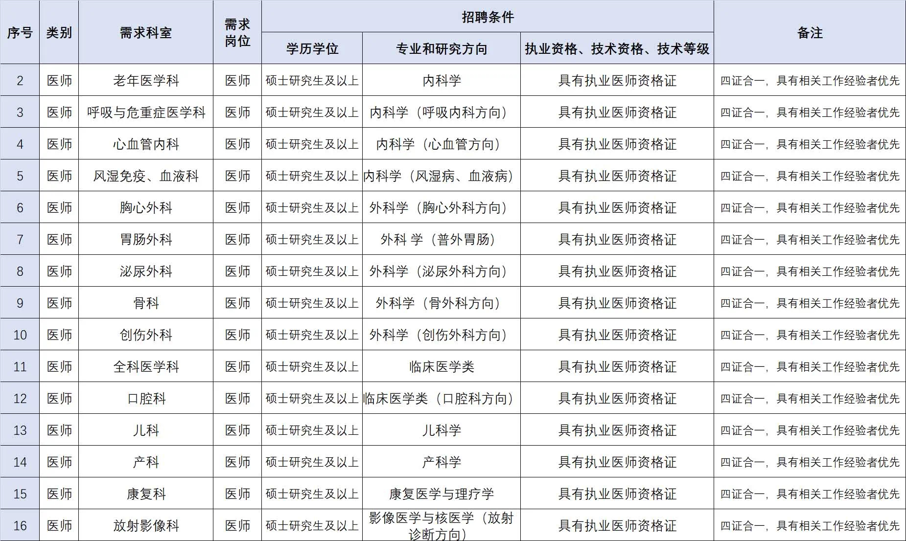根据医院发展战略、老年医学中心建设、学科布局规划、亚专科发展、人才梯队建设、人才储备以及各院区差异化发展等需求,医院现面向社会和高校,招聘医学博士、骨干人才、临床医师及护理人员。具体招聘岗位及条件如下: