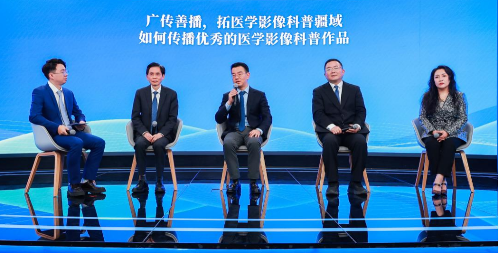 4月24日,北京协和医院放射科高级工程师付海鸿(右二)、四川大学华西医院放射科主任吕粟(左三)、浙江大学医学院附属第二医院放射科负责人余日胜(左二)、云南省第一人民医院心内科副主任护师梁莉雯(右一)、鼎湖创始人林斌(左一)围绕“如何传播优秀医学影像科普作品”展开探讨。主办方供图