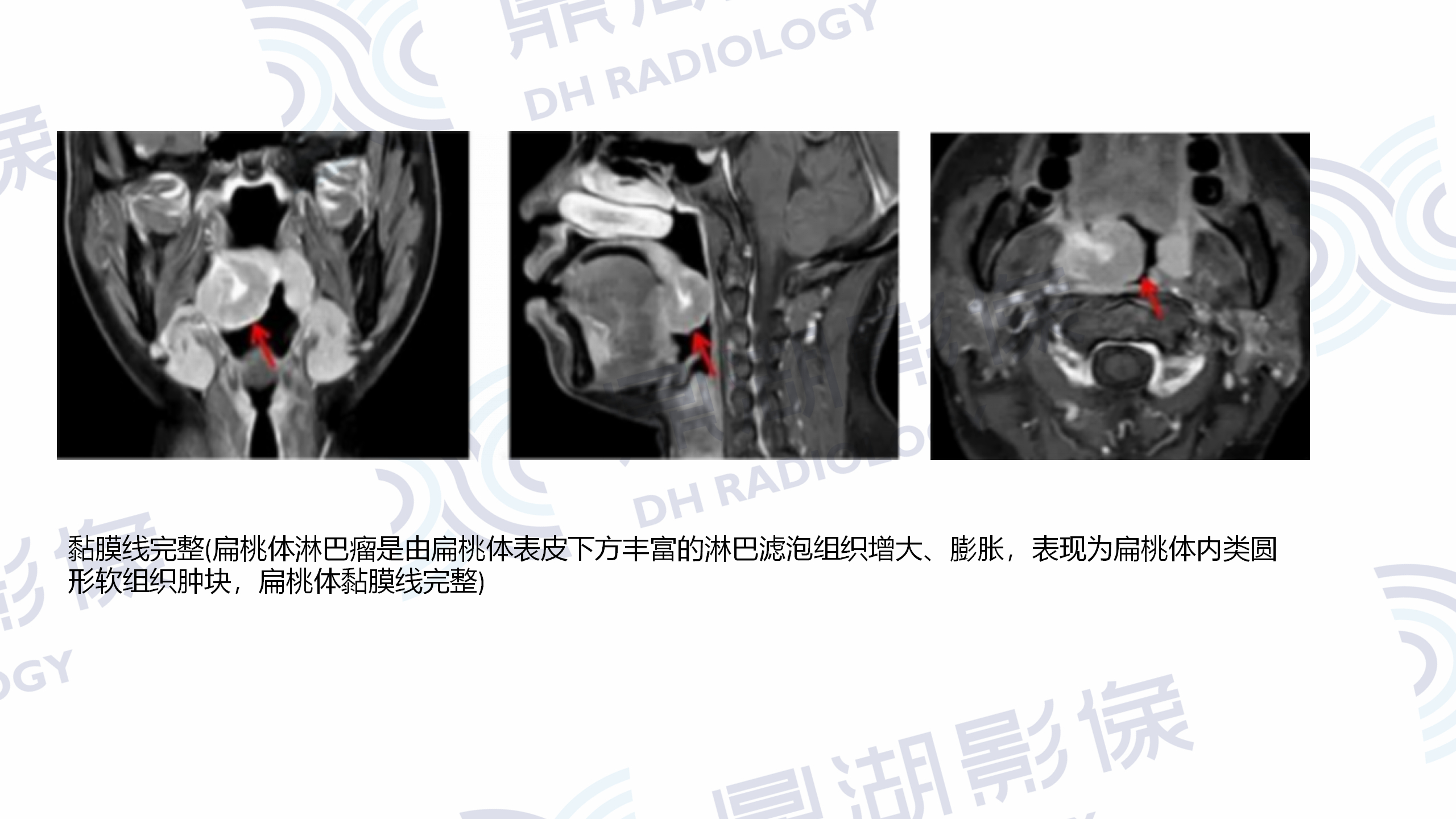 MR增强检查提示:口咽左侧壁至左侧声门上不规则软组织肿块,病灶突入咽腔,信号均匀,T1WI呈等信号,T2W呈稍高信号,DWI呈高信号,增强扫描呈轻度均匀强化,左侧杓状会厌皱襞水肿,左侧梨状窝消失。