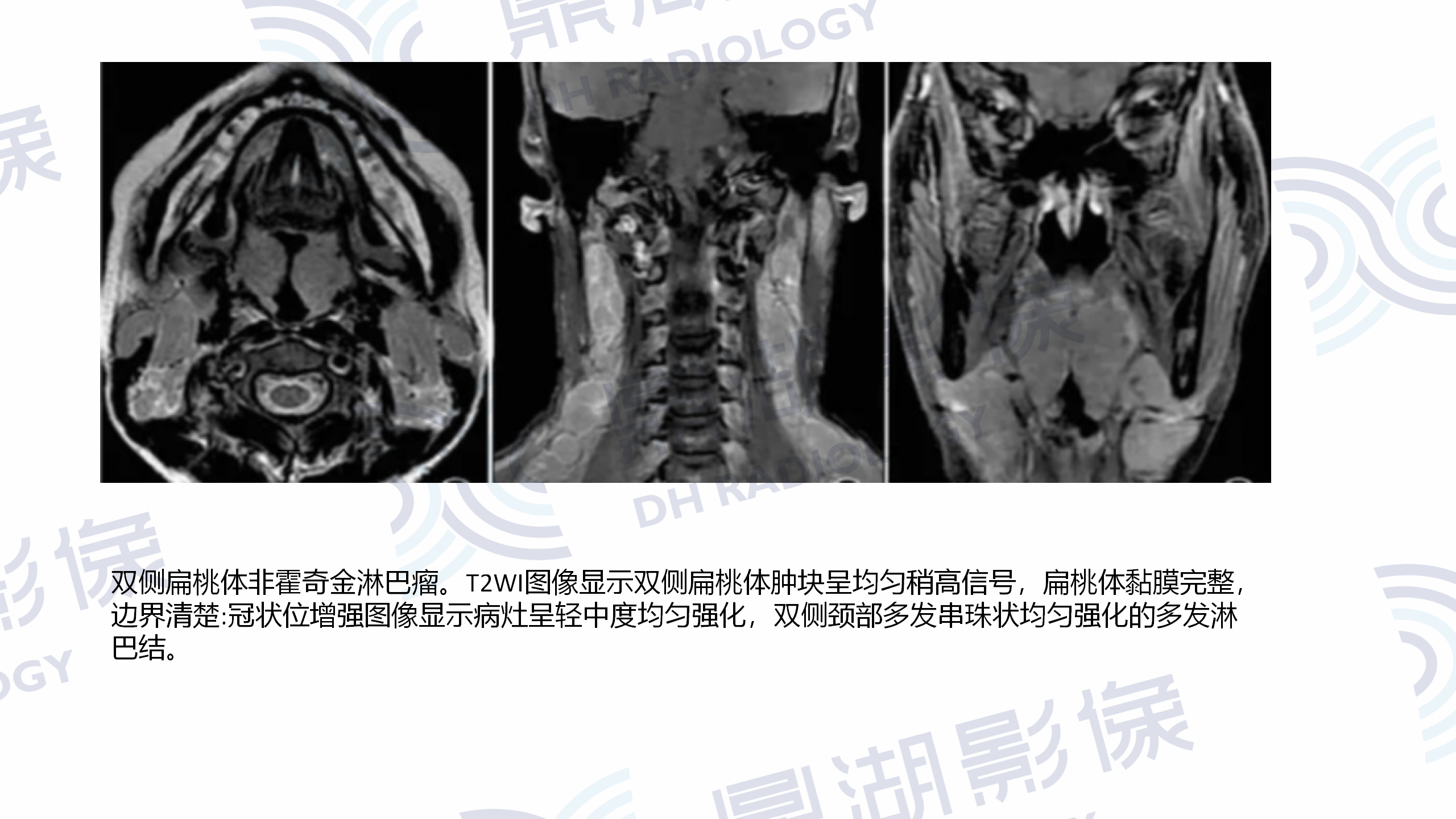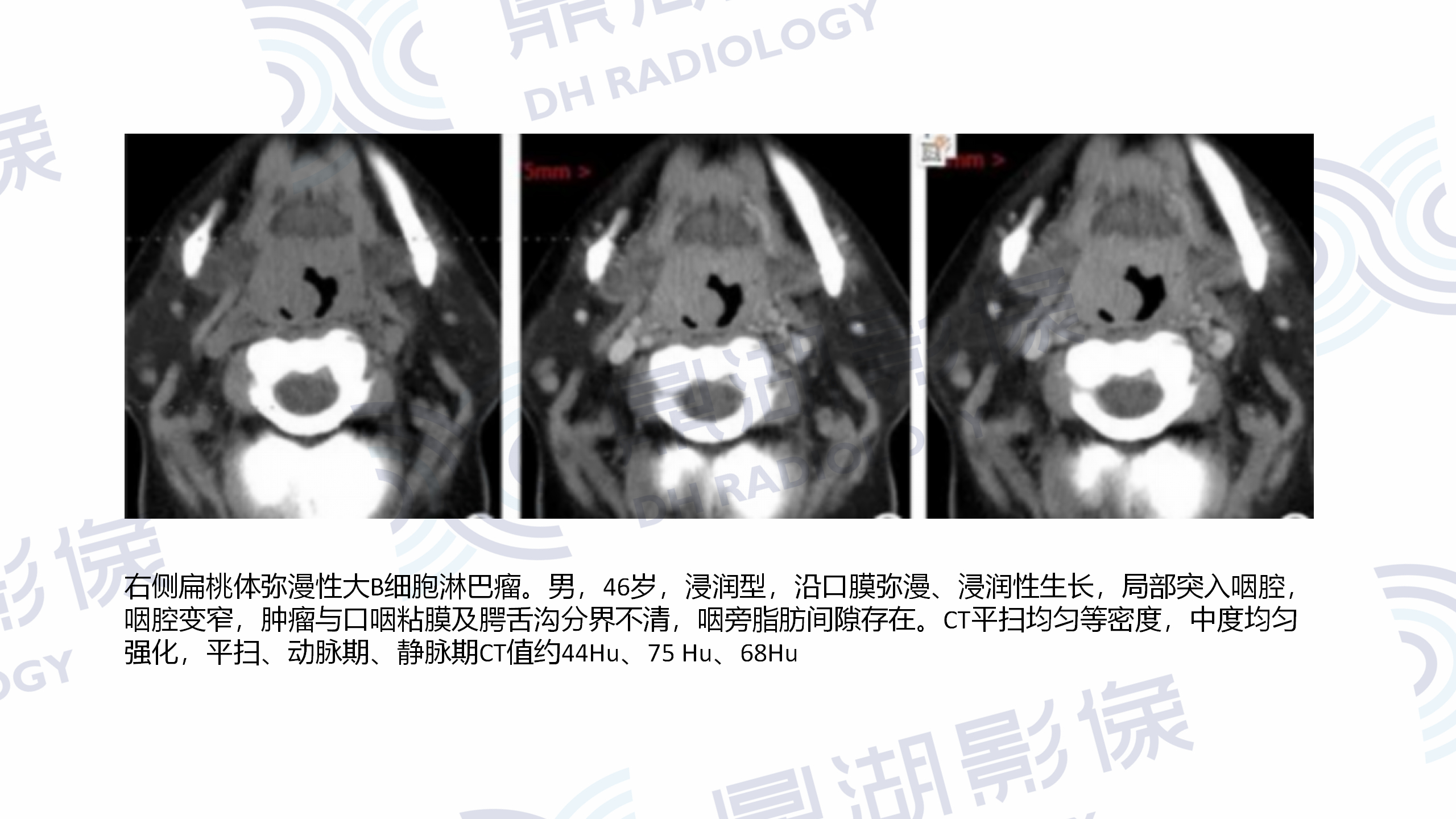 女  23岁  咽部不适1周,喉镜检查示咽部新生物,无疼痛发热等症。血常规实验室检查未见明显异常。本中心MR检查提示口咽恶性肿瘤,疑淋巴瘤可能,于本中心进一步行PET/CT检查。