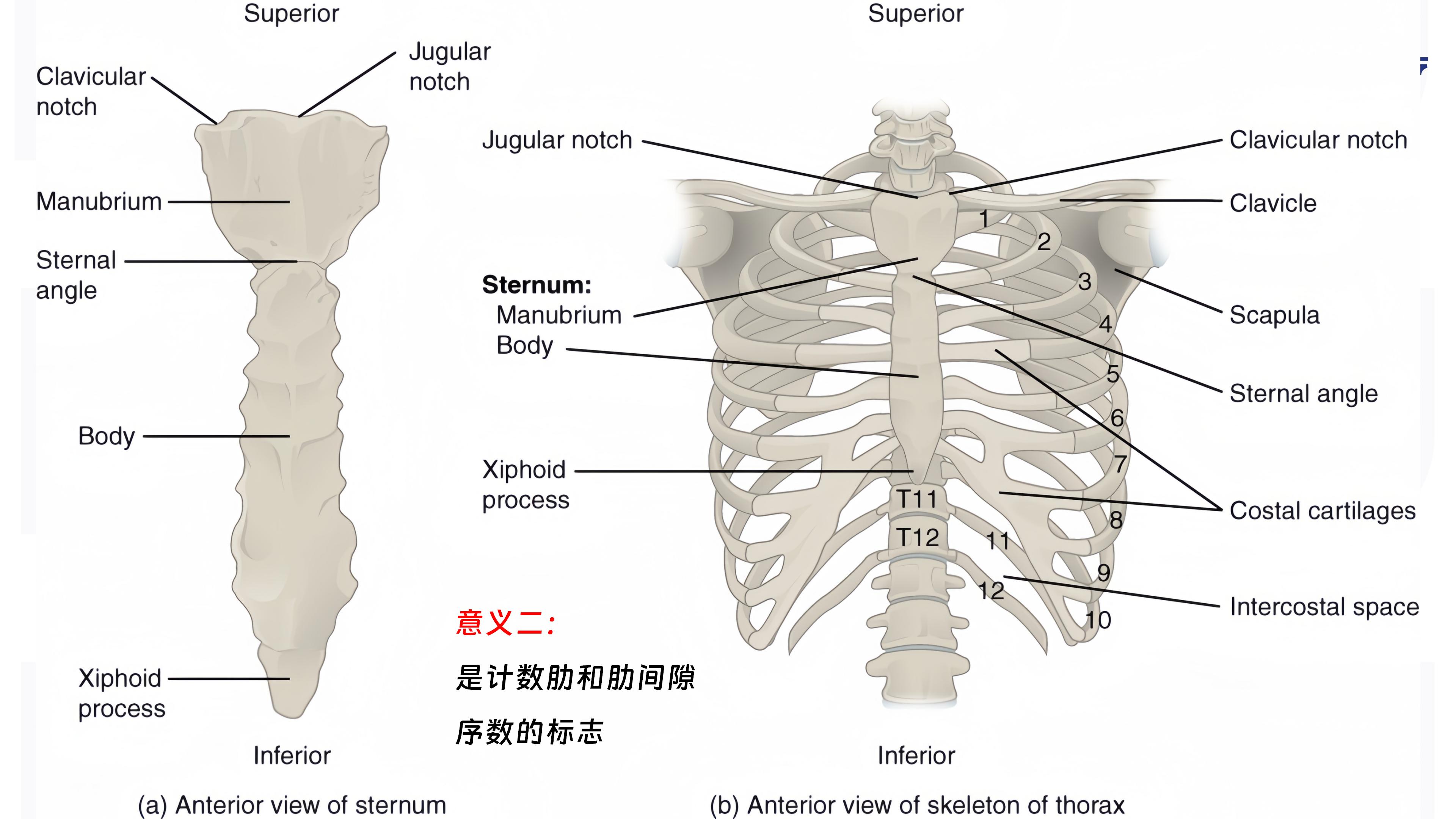 2.心脏病学中最重要的骨骼标志之一。在心电图操作中,可根据胸骨角找到右侧第四肋间隙,从而准确地找出放置V1导联电极的位置;