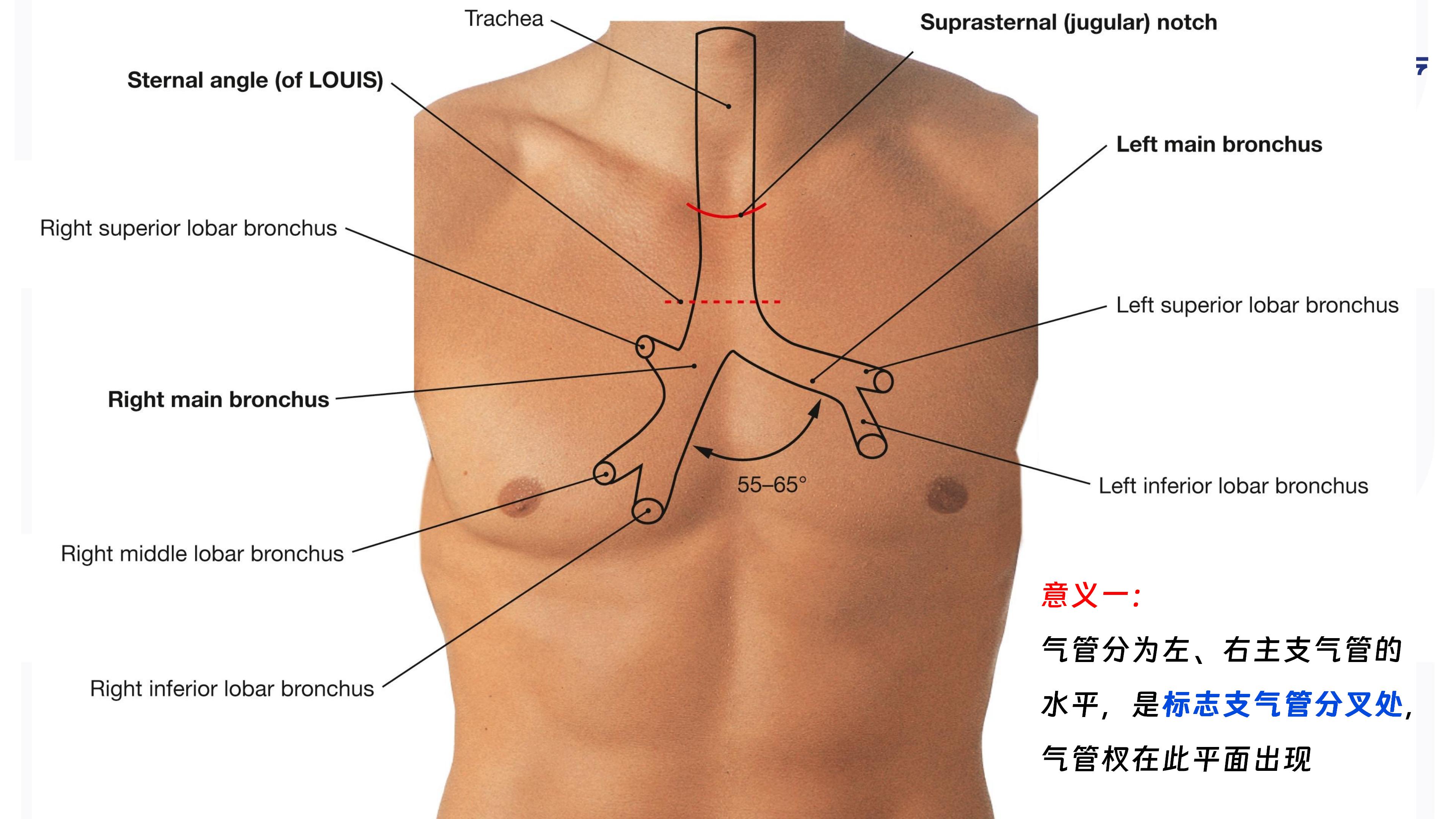 3.气管分为左、右主支气管的水平,是标志支气管分叉处,气管杈在此平面出现