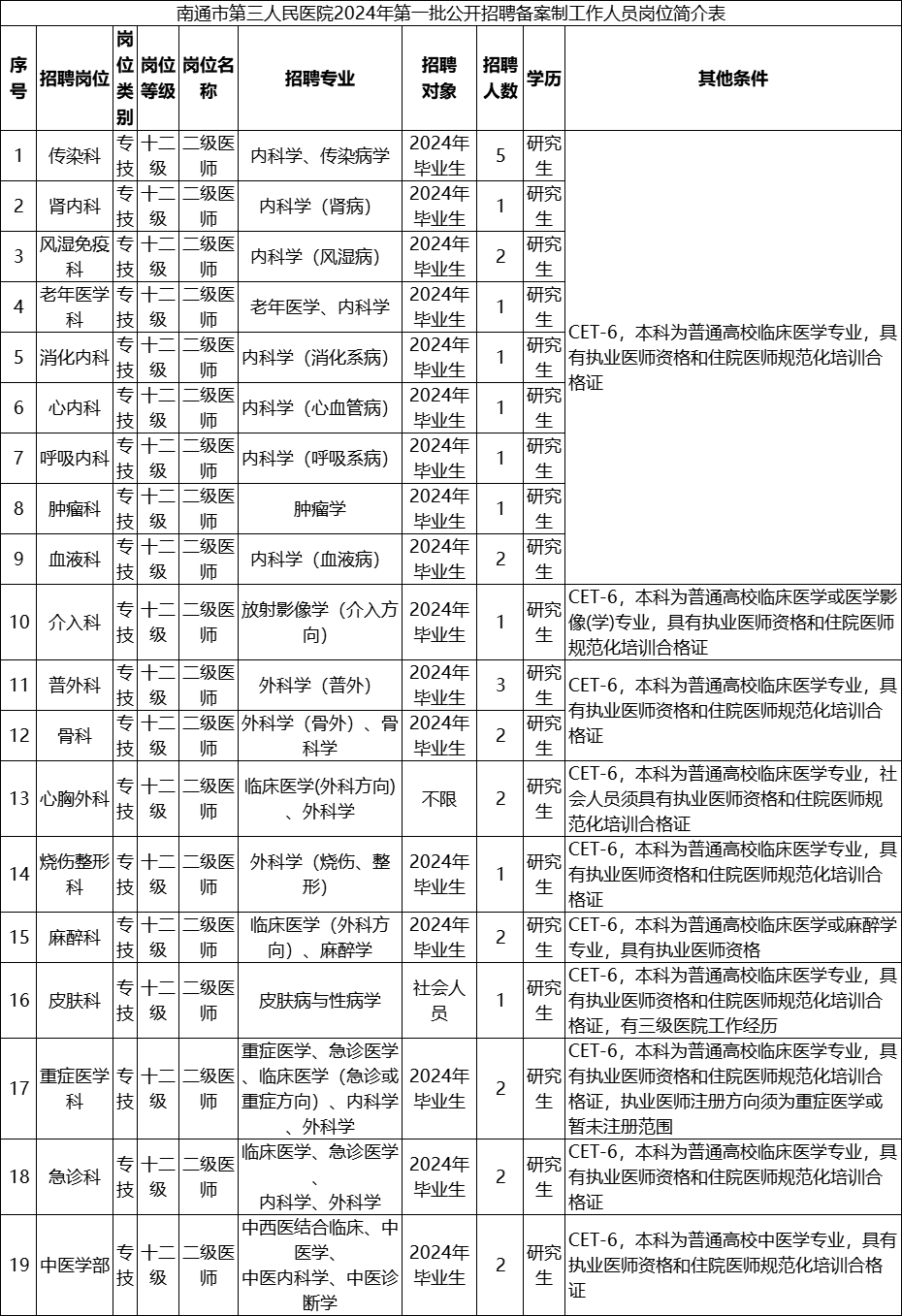 具体岗位及各岗位招聘条件等详见附件:《南通市第三人民医院2024年第一批公开招聘备案制工作人员岗位简介表》(以下简称《岗位简介表》)。