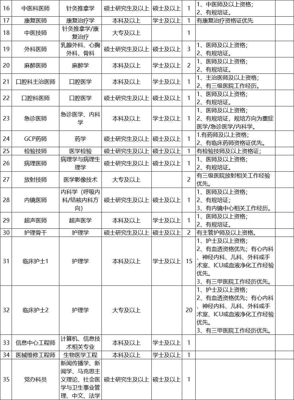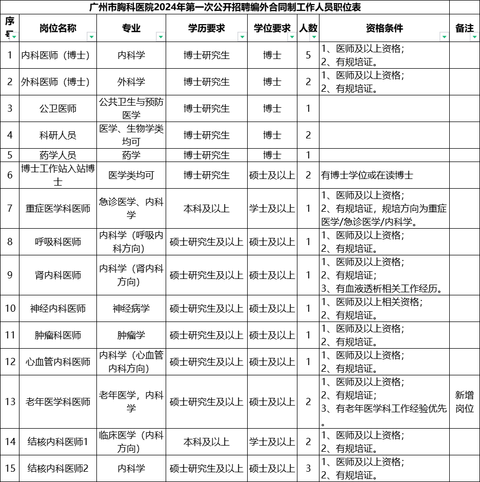 具体招聘岗位及要求见附件:《广州市胸科医院2024年第一次公开招聘编外合同制工作人员职位表》
