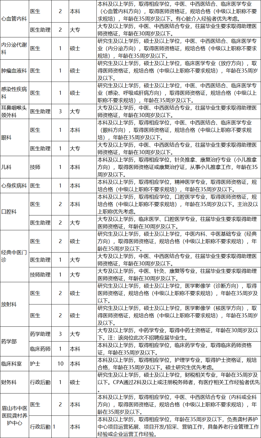 根据工作需要,眉山市中医医院面向社会公开招聘各类人才。现就有关事项公告如下: