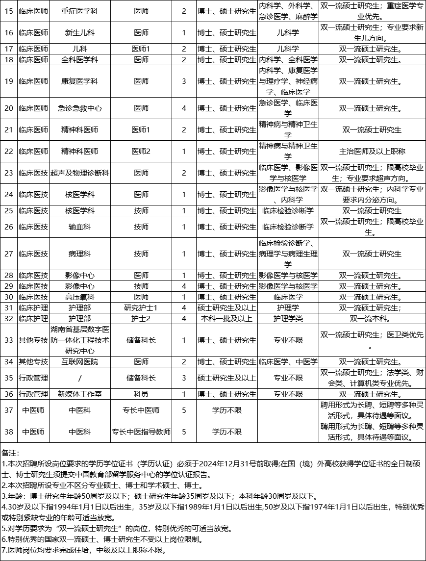 (1) 应聘人员的学历(学位)必须为国家承认的学历(学位)。出国留学人员学历应通过教育部相关部门的学历认证。以上学历学位证书(学历认证)必须于2024年7月31日前取得。岗位要求的住院医师规范化培训合格证(或成绩合格证明),必须于2024年12月31日前取得。未在规定时间内取得,则取消考试或聘用资格;