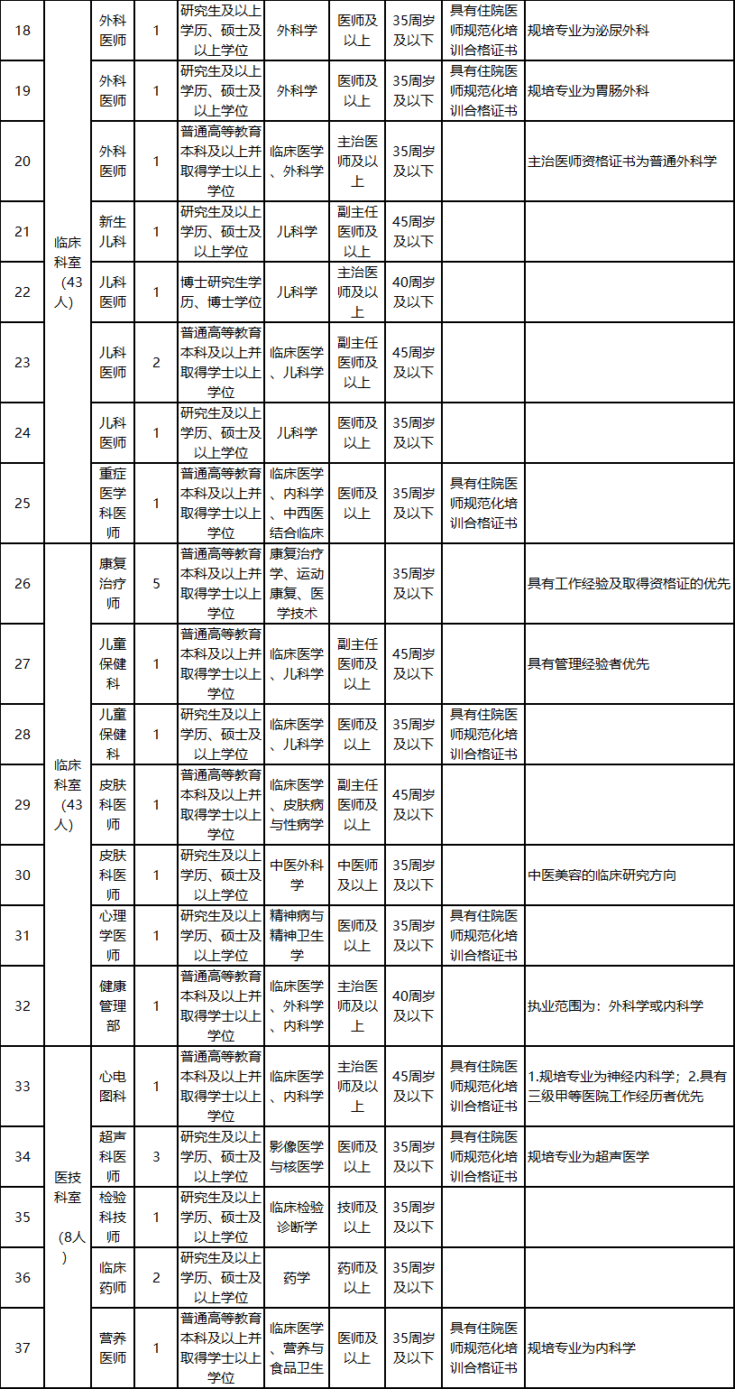 具备我院公开招聘岗位需求表(附件1)相应岗位条件,并同时符合下列条件的社会在职和非在职人员。(注:应聘医师类岗位者,本科学历应当是临床医学专业或与硕士研究生学历专业相一致,所有职称要求均为非基层)