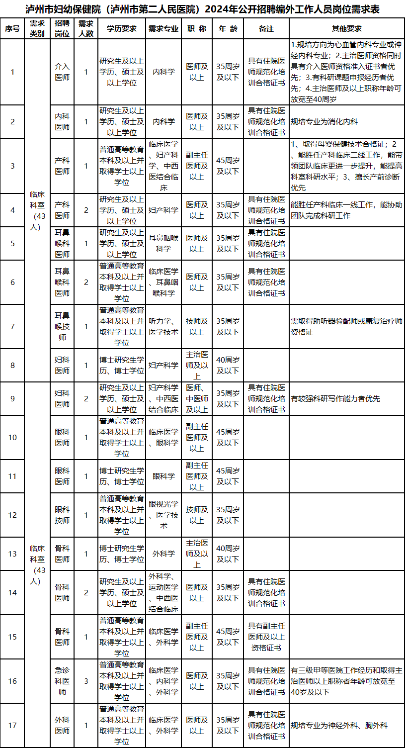 泸州市妇幼保健院(泸州市第二人民医院 泸州市妇女儿童医院)是一所集医疗救治、预防保健、科研教学、健康教育为一体的三级甲等妇幼保健机构。因发展需要,拟向社会公开招聘82名编外工作人员。根据事业单位招聘有关规定,现将相关事项公告如下: