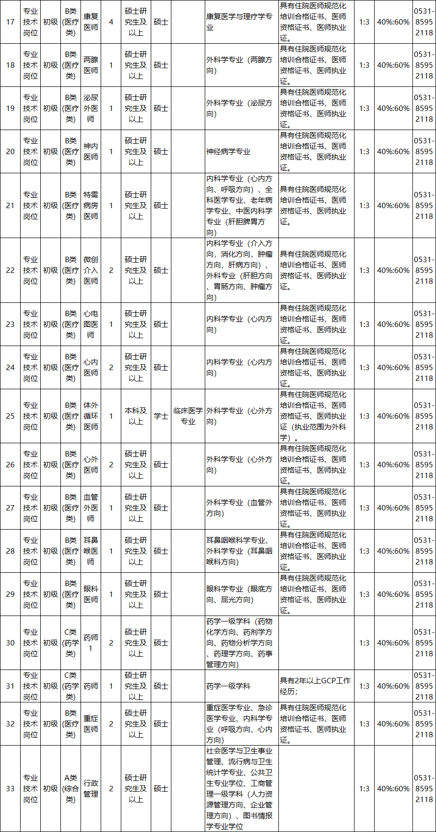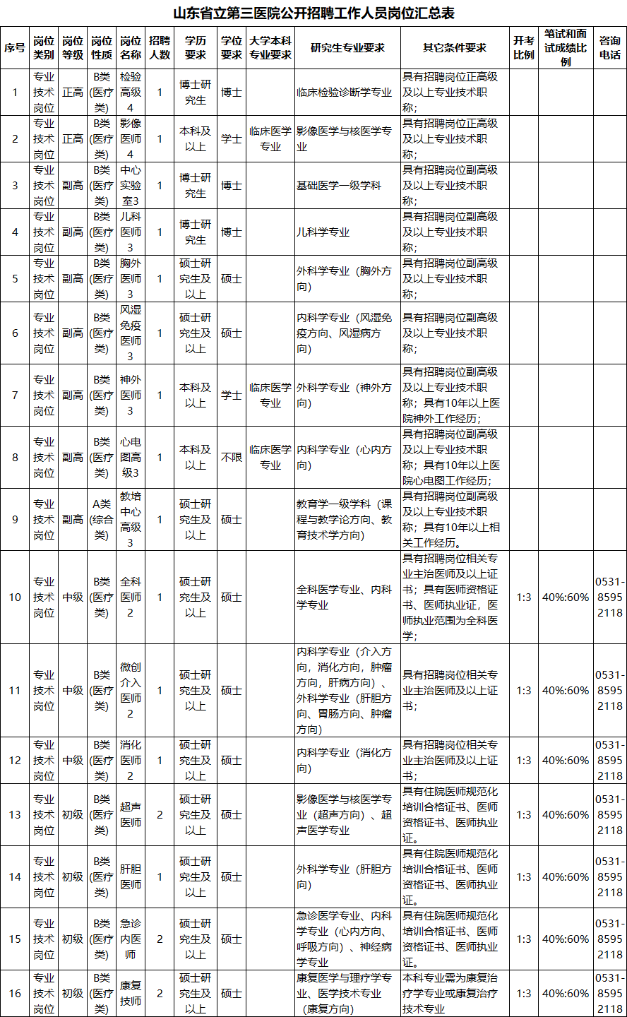 根据事业单位公开招聘有关规定,结合工作需要,山东省卫生健康委所属山东省立第三医院拟面向社会公开招聘工作人员45人,均为专业技术岗位。其中,高级岗位9人,中级岗位3人,初级岗位33人。具体岗位及条件详见《省属事业单位公开招聘工作人员岗位汇总表》(附件1)。
