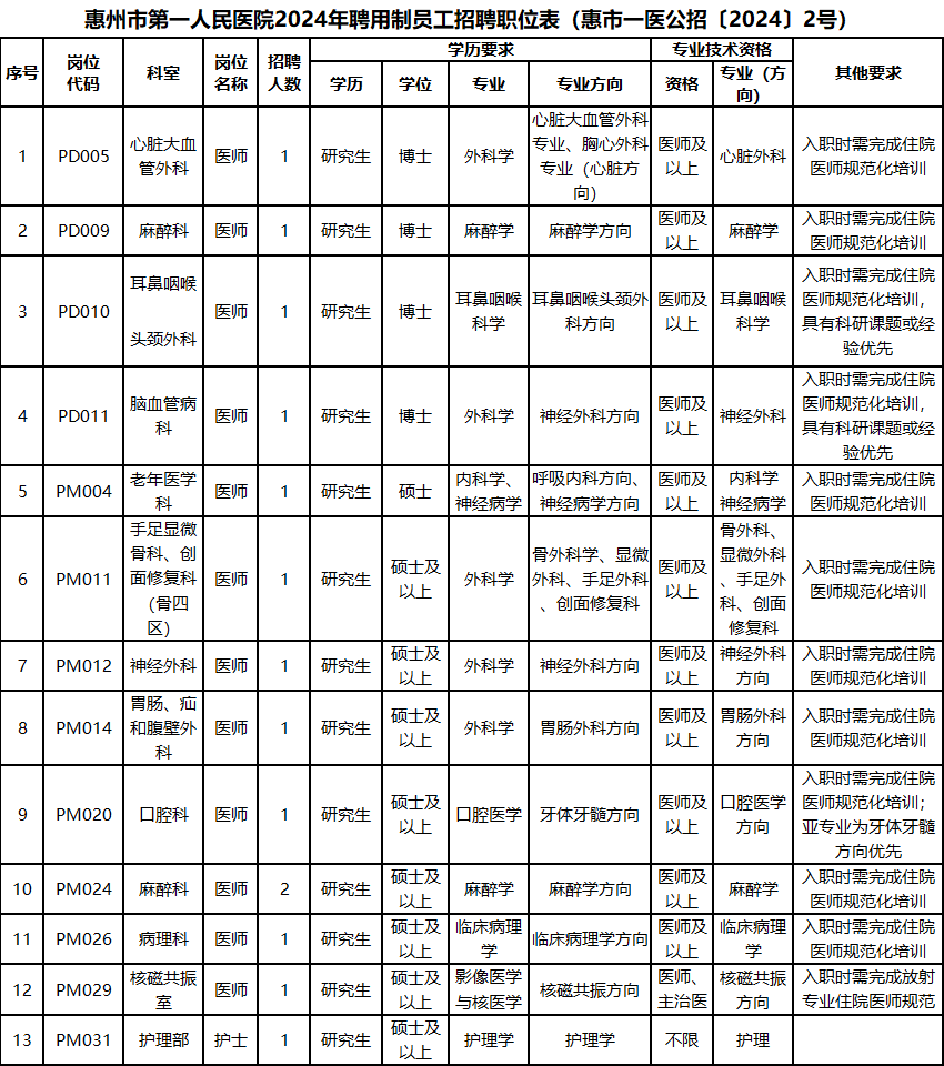 招聘工作接受惠州市第一人民医院监督部门全程监督,监督电话:0752-2883021