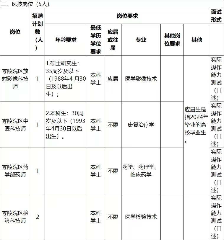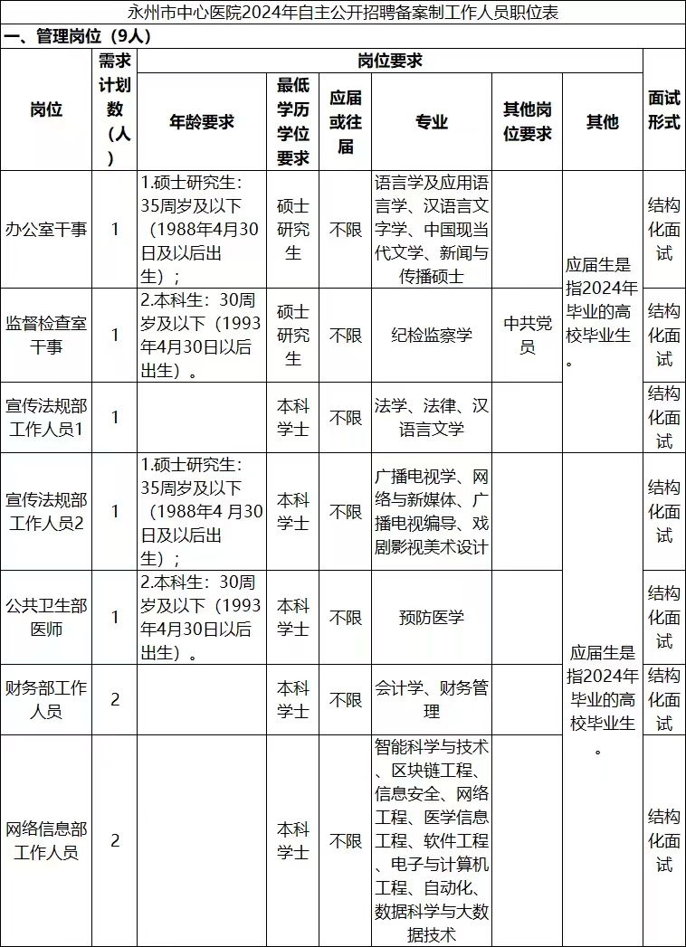 详见《永州市中心医院2024年自主公开招聘备案制工作人员职位表》(附件1)。