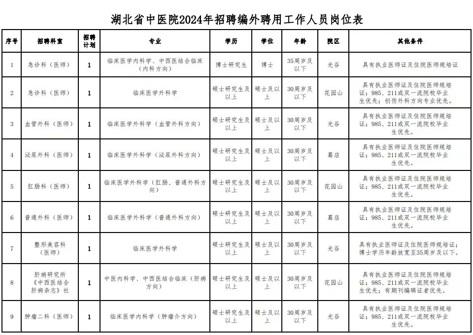 根据我院工作需要,湖北中医院(湖北中医药大学附属医院)面向社会公开招聘编外聘用工作人员58名。公告如下: