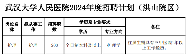 (二)护理岗位。职数200人,要求:博士、硕士或全日制本科学历、护理学专业;往届须具有1年以上三甲医院工作经历。招聘计划、要求详见下方附件二。