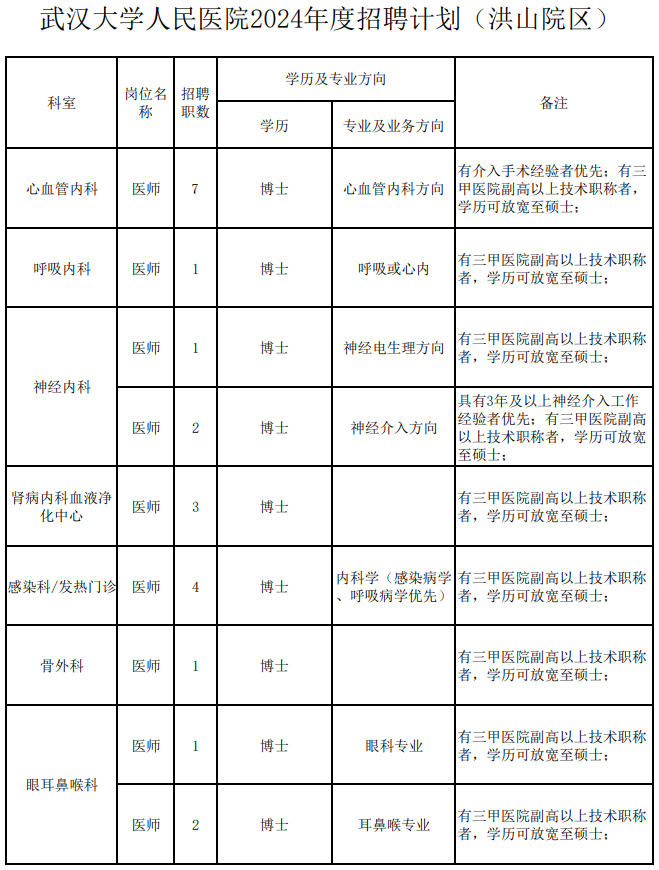 一、2024年度招聘计划(洪山院区招聘)