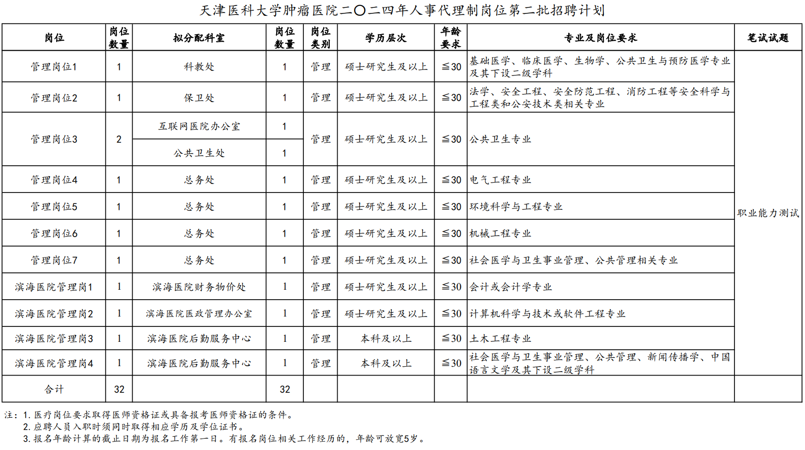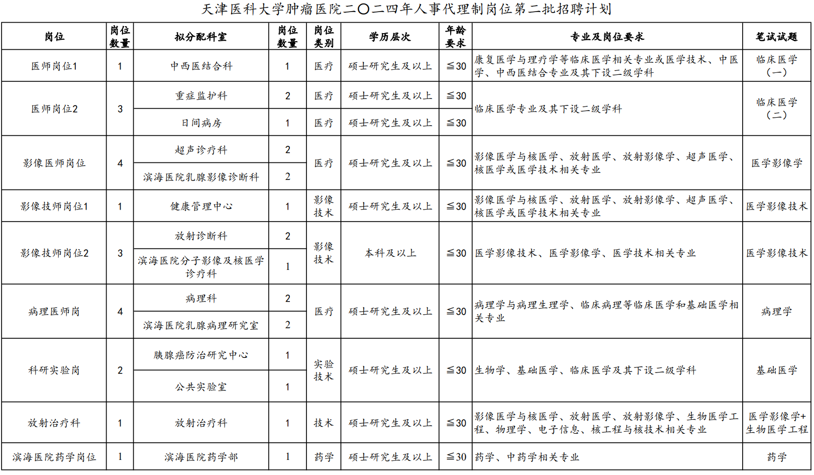 8.岗位所需的其他条件详见附件1《天津医科大学肿瘤医院二〇二四年第二批人事代理制岗位招聘计划》。