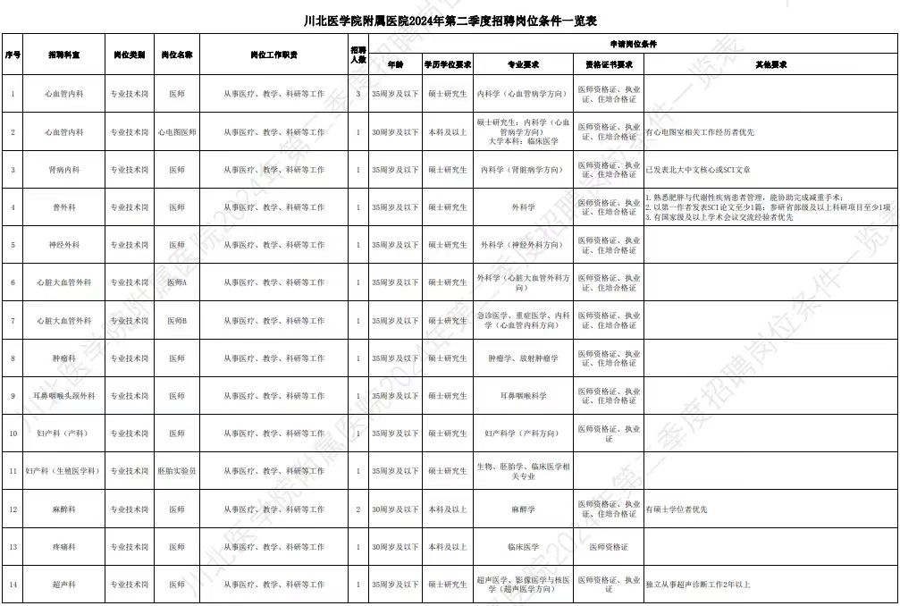 面向全社会招聘2024年7月31日前取得普通高等教育大学本科及以上学历学位(含持有国家教育部留学服务中心认证学历、学位的境外留学人员和赴台生),并完全符合《川北医学院附属医院2024年第二季度招聘岗位条件要求一览表》(见附件,以下统一简称《岗位条件要求一览表》)相关岗位条件要求和本公告其他要求的人员。