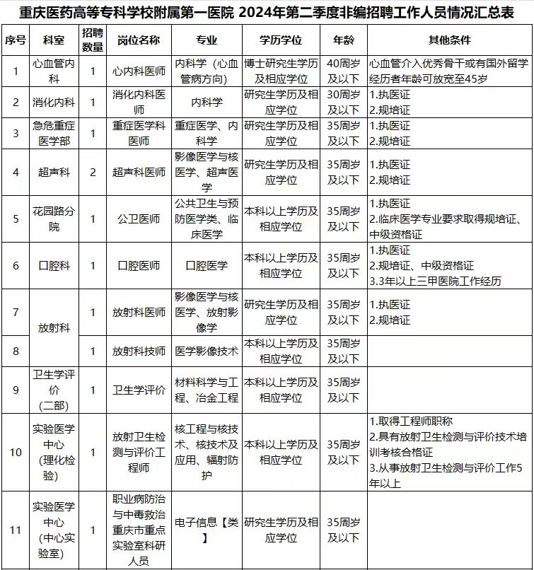 重庆医药高等专科学校附属第一医院招聘超声医师2名、放射医师1名、放射技师1名