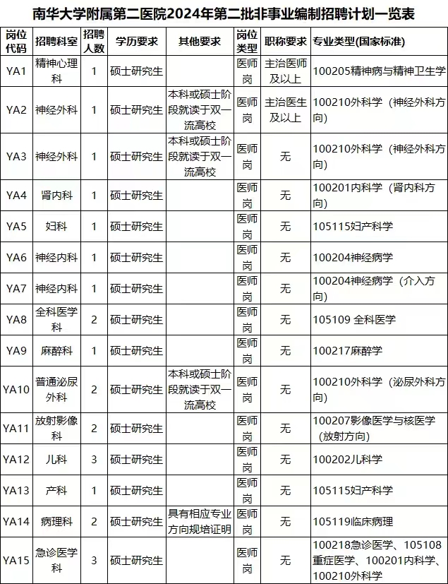 此次招聘岗位26个;招聘计划42名,其中医师岗31名(YA类),技师岗3名(YB类),护理岗7名(YC类),行后岗1名(YD类)。具体详见附件1《南华大学附属第二医院2024年第二批非事业编制招聘计划一览表》