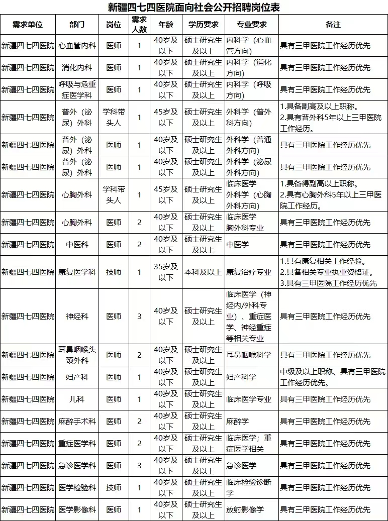 面向社会公开招聘,符合岗位条件的应聘人员均可报名应聘。具体岗位条件详见《新疆四七四医院面向社会公开招聘岗位表》(附件1)
