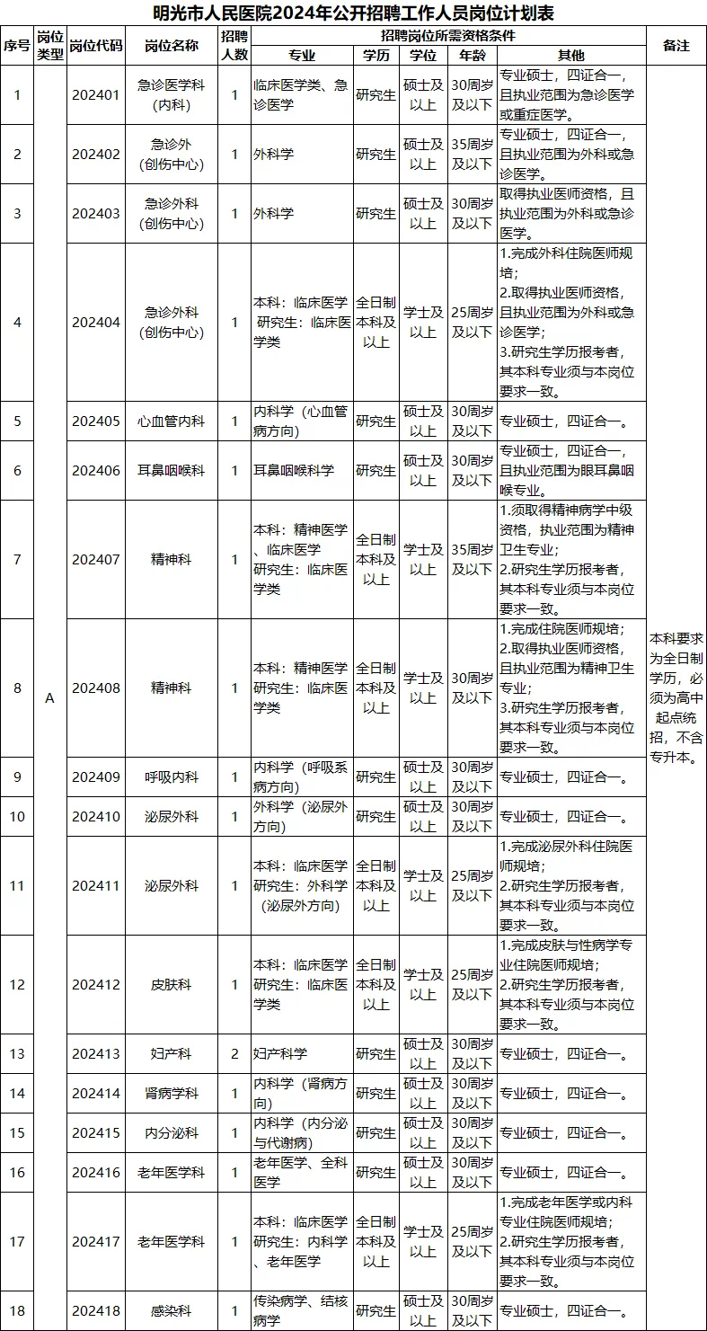 本次招聘设43个岗位(A类岗位采用直接面试的方式,不设置开考比例。B类岗位采用笔试+面试的方式),具体岗位详见附件《明光市人民医院2024年公开招聘工作人员岗位计划表》(以下简称《岗位计划表》)。