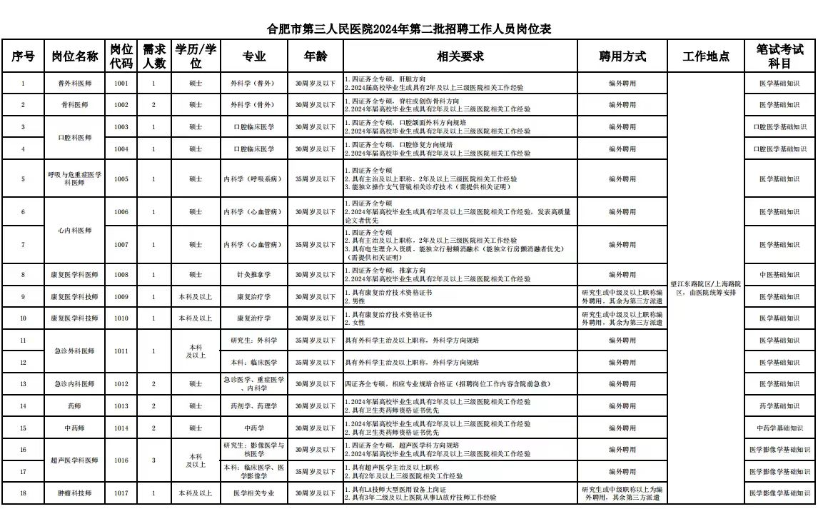 具体岗位及条件详见附件《合肥市第三人民医院2024年第二批招聘工作人员岗位表》。