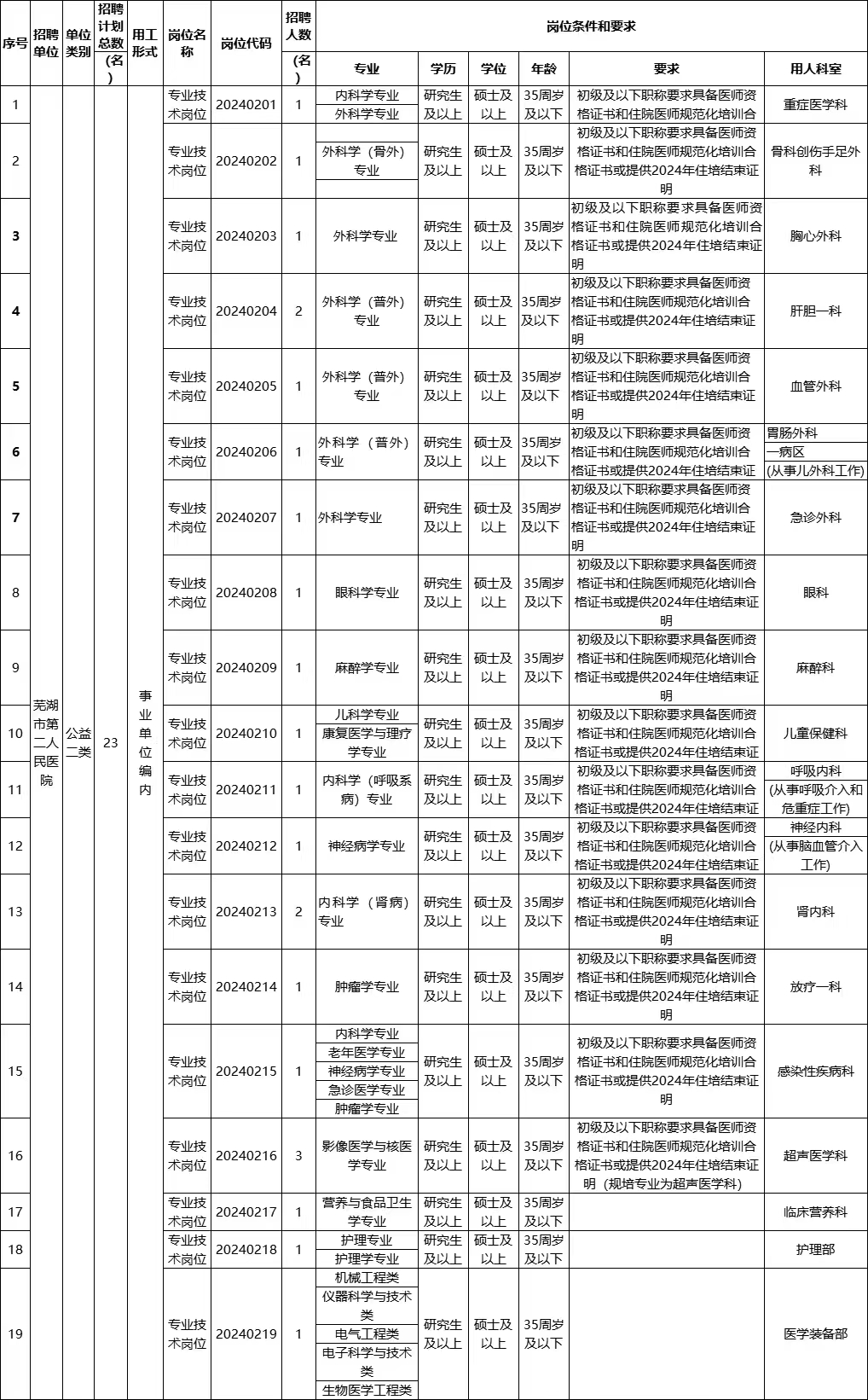 2024年度市二院招聘编内工作人员23名,详见《市二院2024年公开招聘编内工作人员岗位表》(附件1)。招聘公告在芜湖市第二人民医院官网(http://www.whsph.com/)发布。确因报考人数过少等原因需要更改或取消的,提出更正或取消的内容和理由,并通过同一信息渠道发布更正公告。