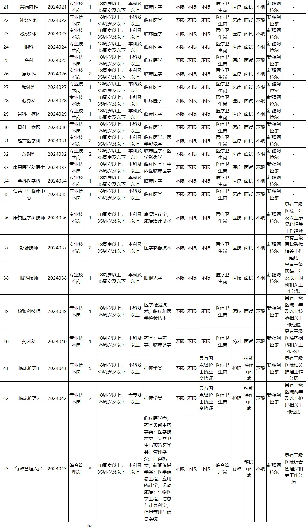 此次第一师阿拉尔医院计划招聘工作人员62名,其中:医疗卫生类59人,综合管理类3人。详见《第一师阿拉尔医院2024年度编制备案制招聘计划岗位表》(附件1,以下简称岗位表)。