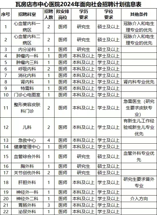 招聘岗位及用人条件详见附件1(《瓦房店市中心医院2024年面向社会招聘计划信息表》)。