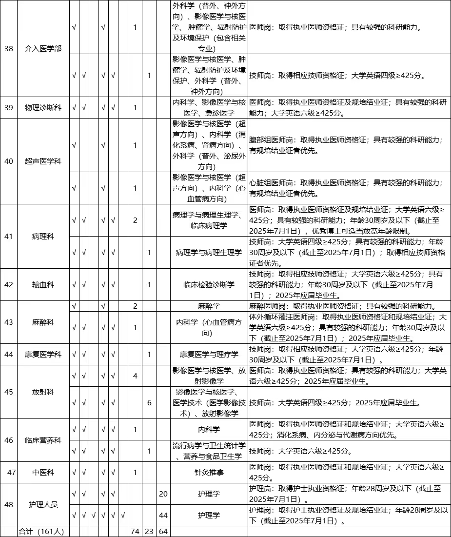 医师岗、医技岗、护理岗、科研岗及其他专业技术岗(具体要求详见附件)。