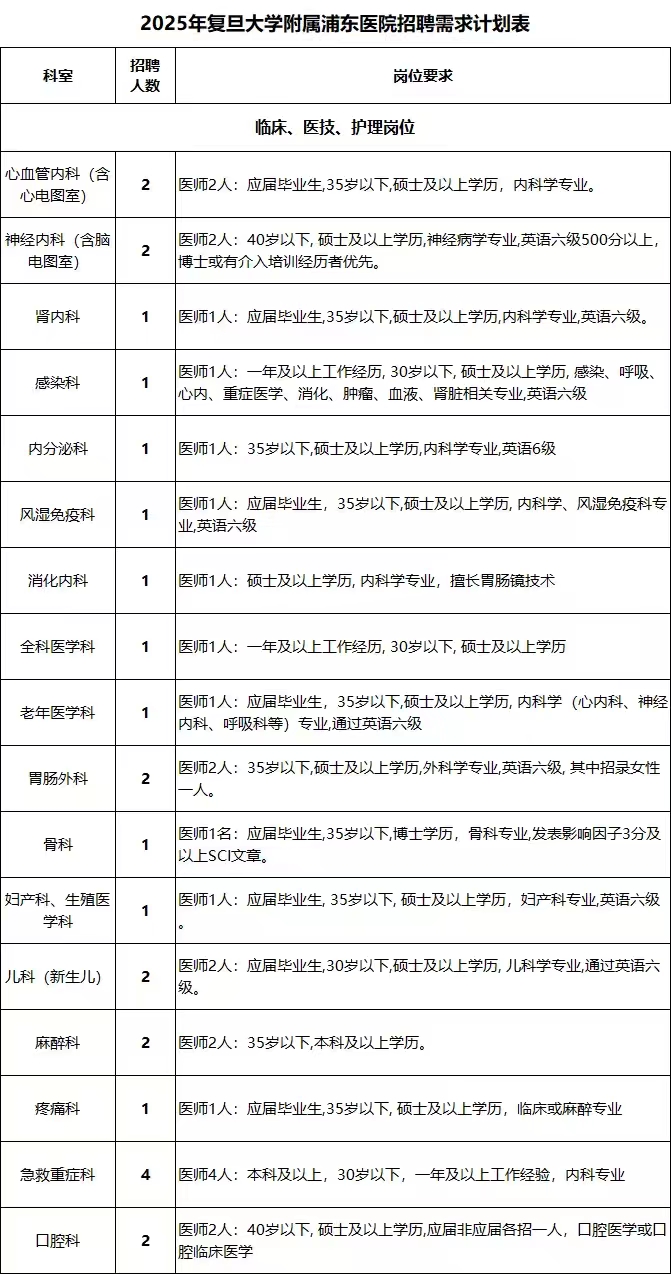 2、医院地址:上海市浦东新区拱为路2800号,人力资源部;