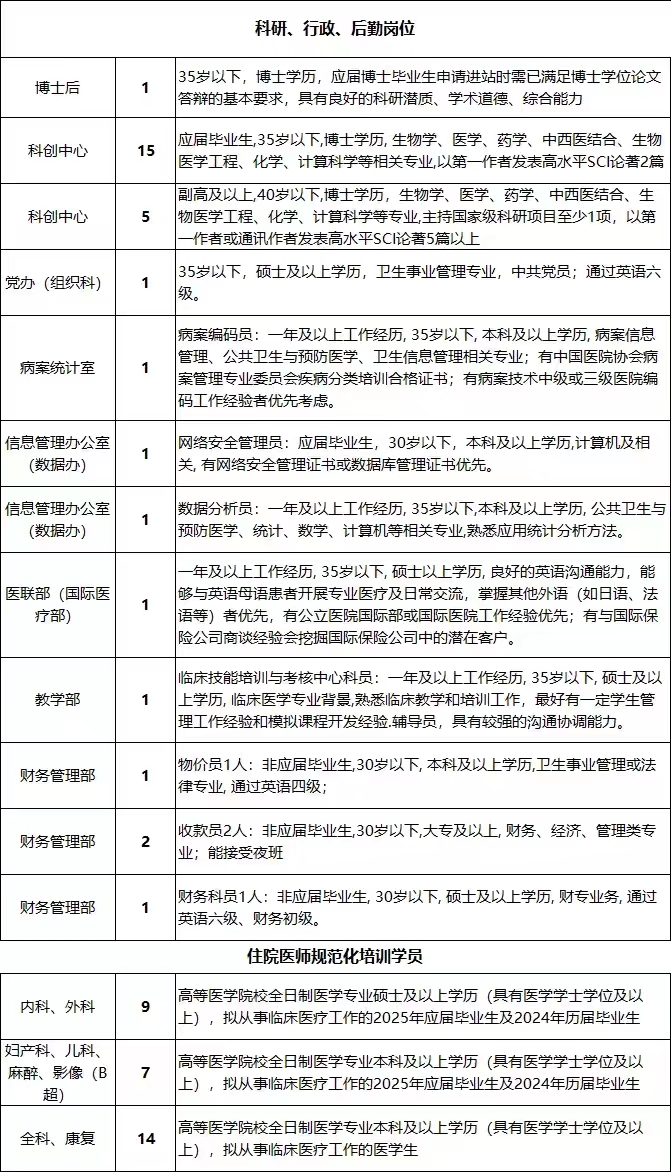 (1)5年及以上三级医院工作经验,有较强的临床技能和科研能力;有较强的临床技能和科研能力,具有主持国家级项目的潜力或具备填补本院医疗技术和项目空白的能力;