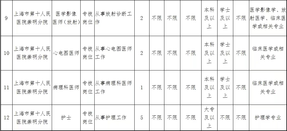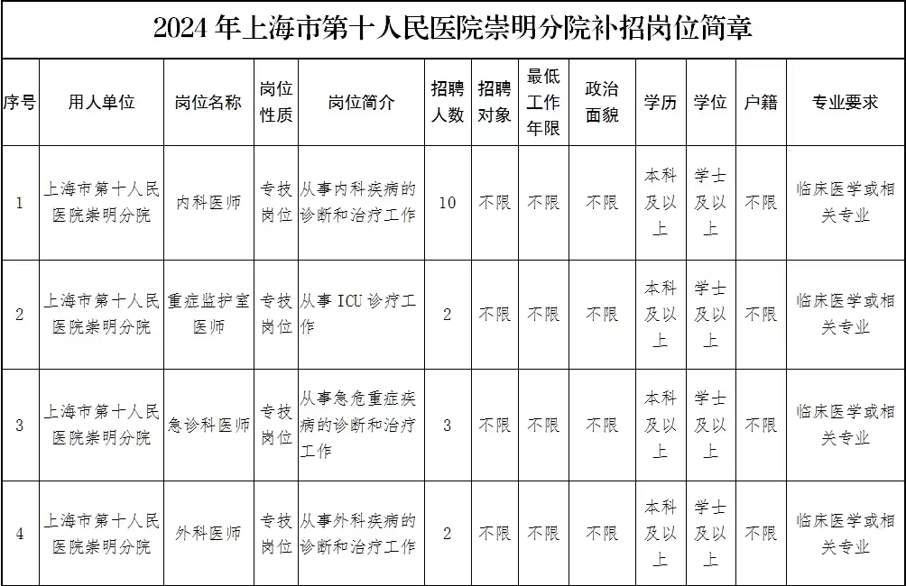 根据《崇明区卫生健康系统医疗卫生专业技术人才招聘办法》(沪崇卫〔2022〕21号)及2024年上海市第十人民医院崇明分院卫生专业技术人员招聘情况,现开展秋季招聘工作,有关事项公告如下: