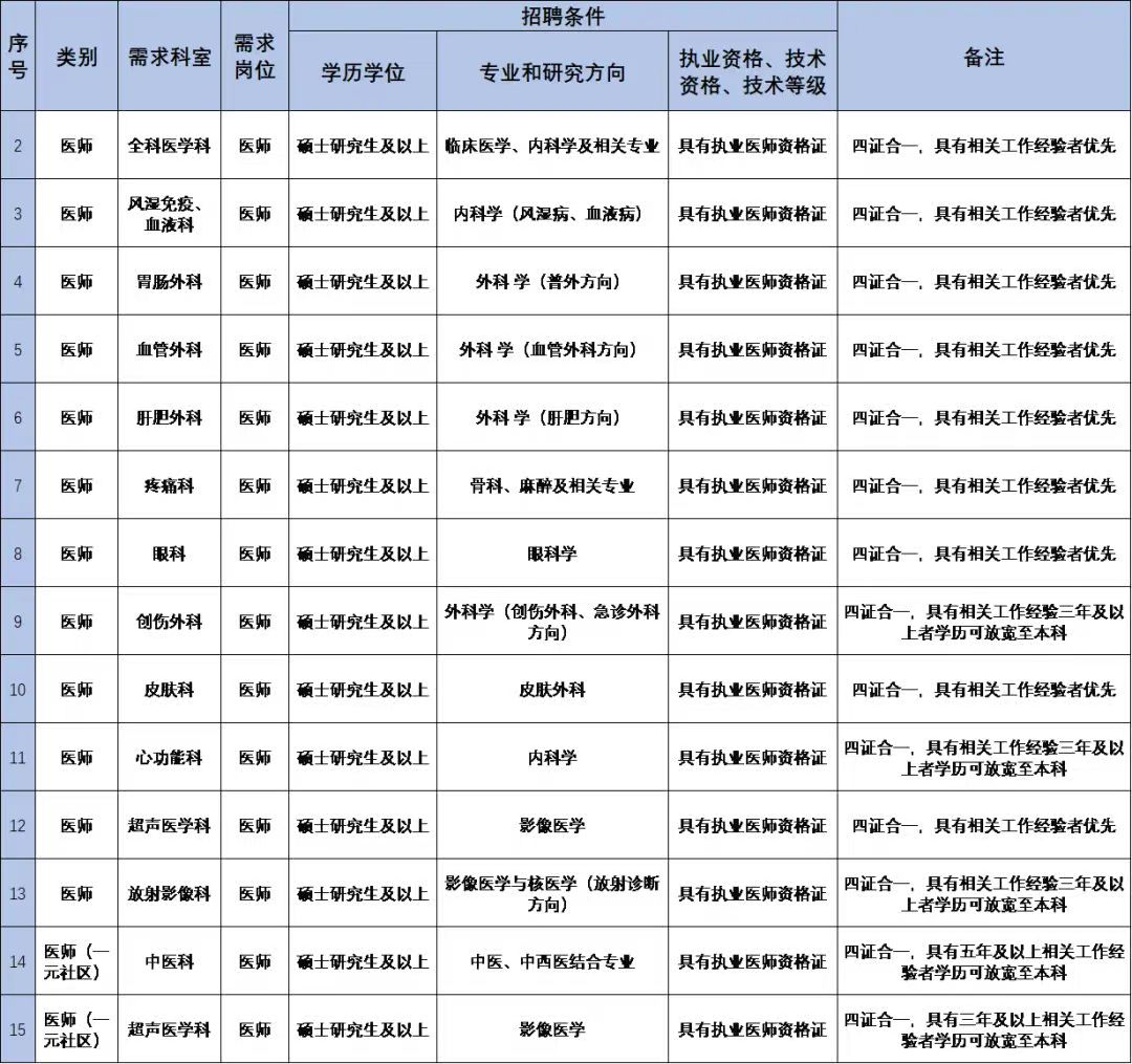 根据医院发展战略、老年医学中心建设、学科布局规划、亚专科发展、人才梯队建设、人才储备以及各院区差异化发展等需求,医院现面向社会和高校,招聘医学博士、临床医师。具体招聘岗位及条件如下: