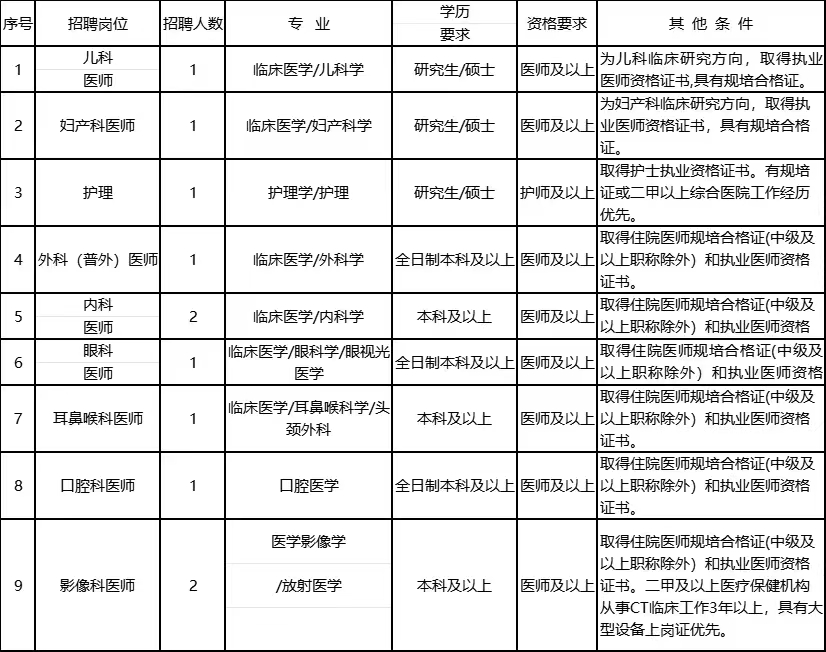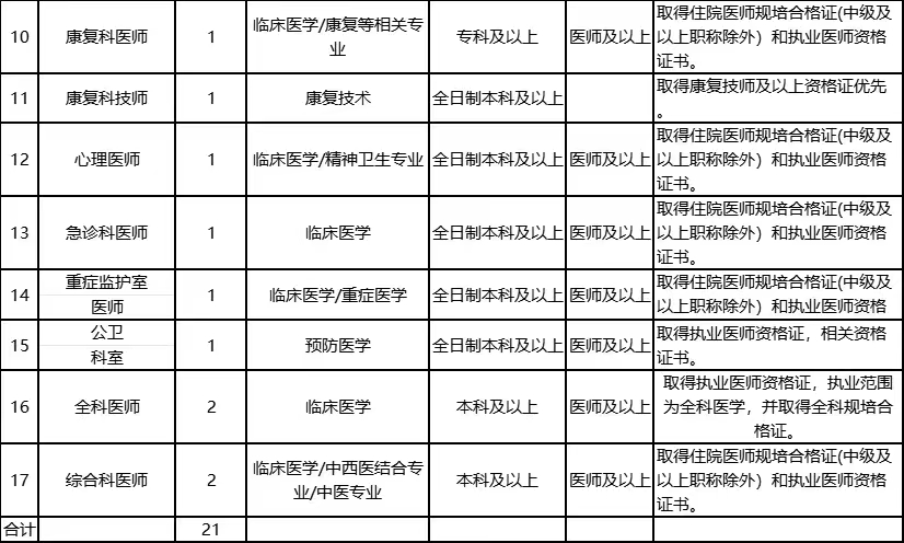 本次面向社会公开招聘儿科医师等17个岗位共21名工作人员(见附件)。