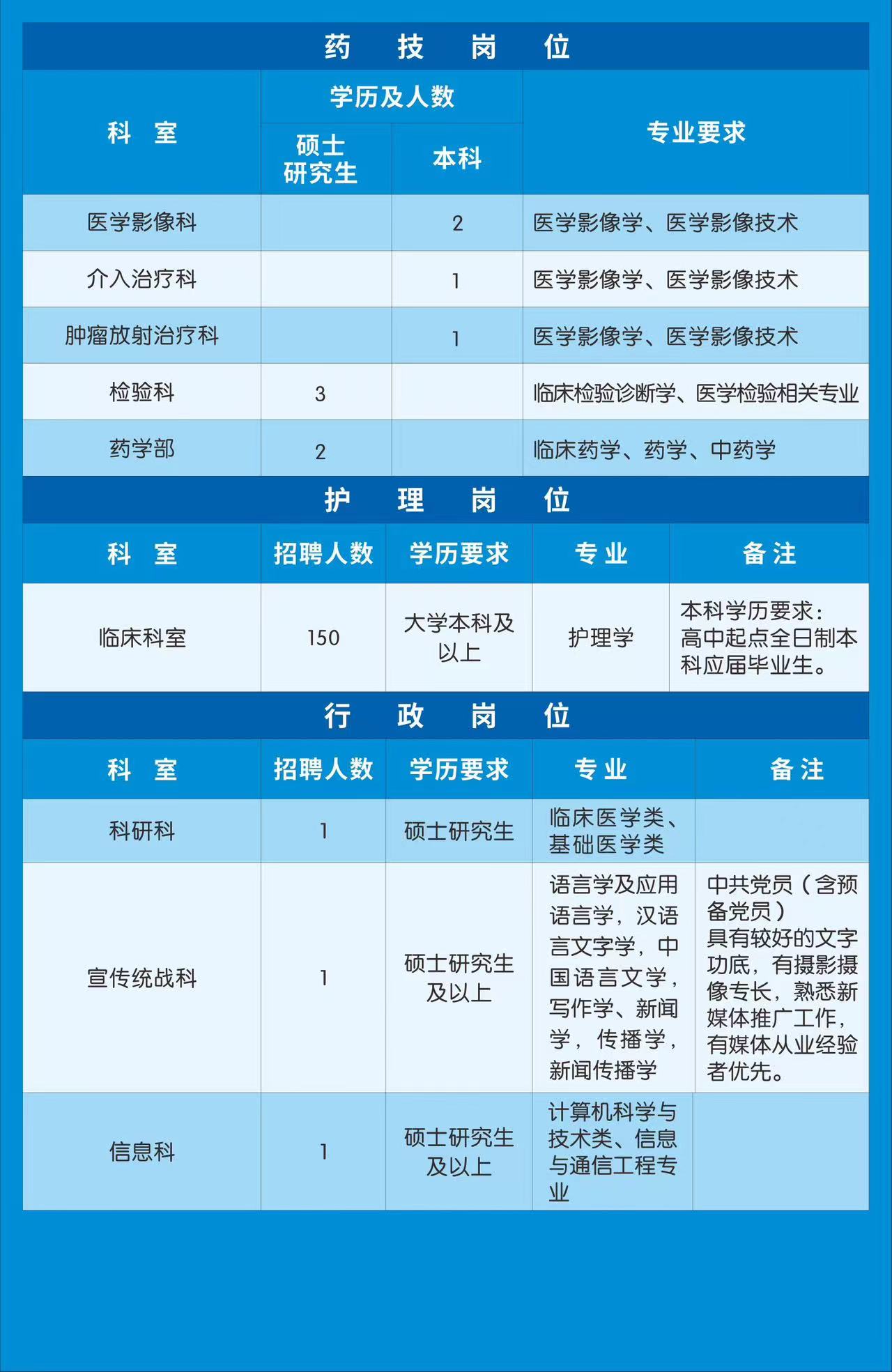 4.临床医师、医技人员一般要求35周岁以下,特别优秀者可酌情放宽条件;护理人员要求为应届毕业生,30周岁以下,硕士研究生及以上学历者可放宽年龄条件。