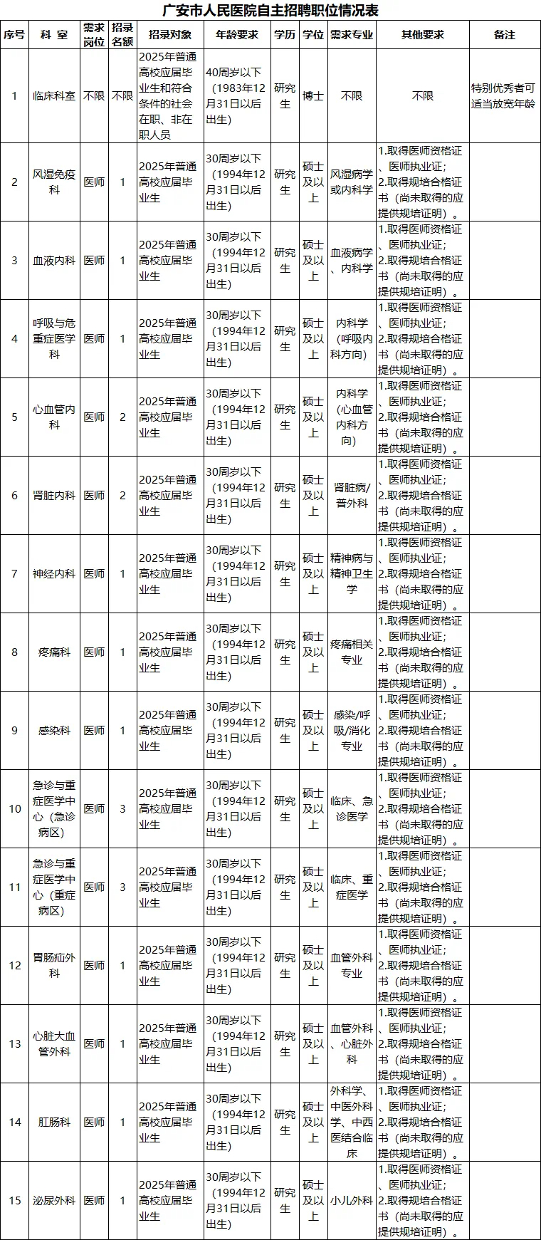 根据广安市人民医院(四川大学华西广安医院)发展规划和工作需要,特对外招聘卫生专业技术人员若干名,招聘条件如下。